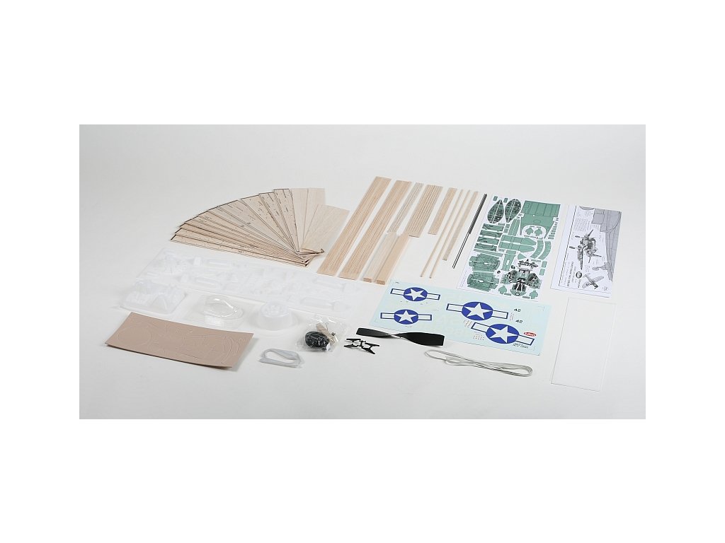 Stavebnice obsahuje: balsové předseknuté díly, balsové nosníky, předseknuté díly z plastikové překližky, vakuově lisované maketové díly (kryt motoru, motor...), čirý acetátový výlisek krytu kabiny, plastovou vrtuli s hřídelí a hlavicí, gumový svazek (guma 5x1mm), ocelovou strunu na podvozek a další drobné díly, plastová kola, potahový papír, rukojeť a vahadlo pro upoutaný model, velký aršík mokrých obtisků, stavební plán.