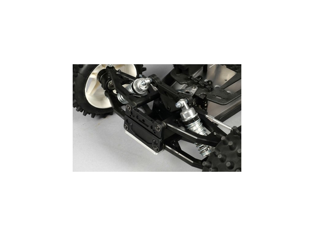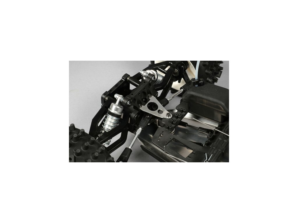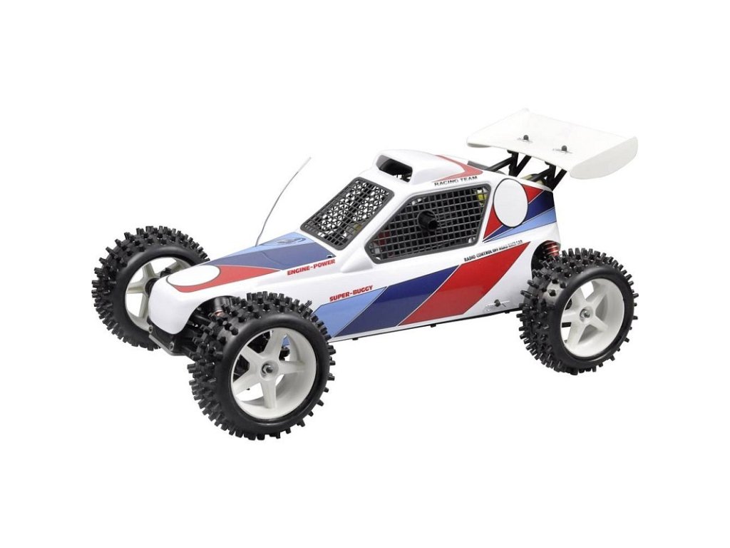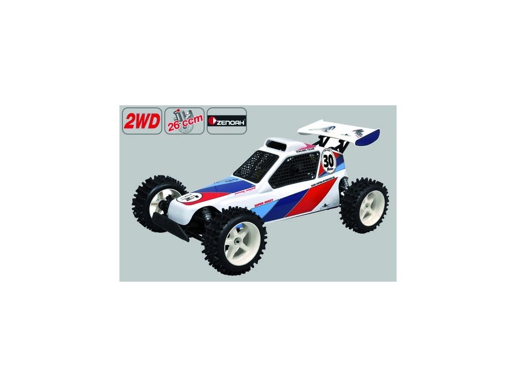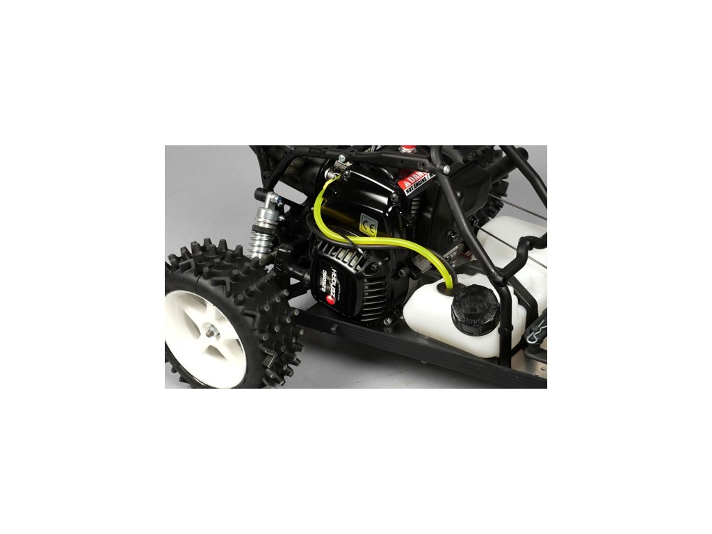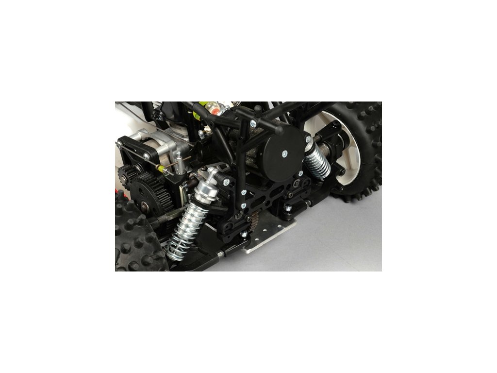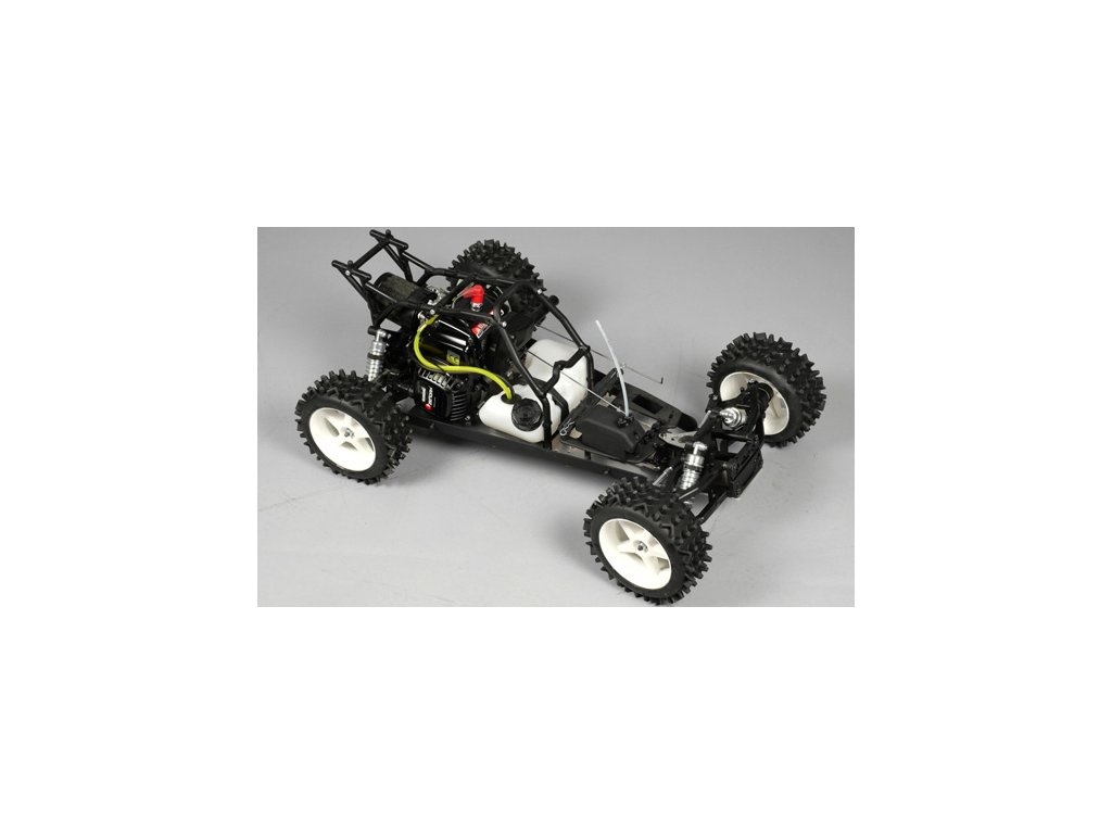 Sestavený model v 1/6 s bílou karoserií a náhonem zadní nápravy osazený spalovacím motorem ZENOAH 26ccm. Model bez kompletní elektroniky