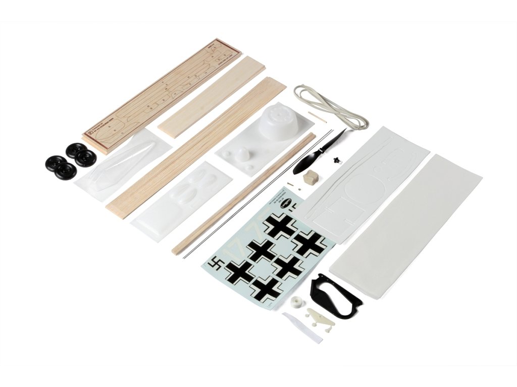 Stavebnice obsahuje: balsové předseknuté díly, balsové nosníky, vakuově lisované maketové díly (kryt motoru, kabiny...), plastovou vrtuli s hřídelí a hlavicí, gumový svazek (guma 5x1mm), plastová kola, ocelovou strunu na podvozek a další drobné díly, plastová kola, potahový papír, aršík mokrých obtisků, stavební plán.
