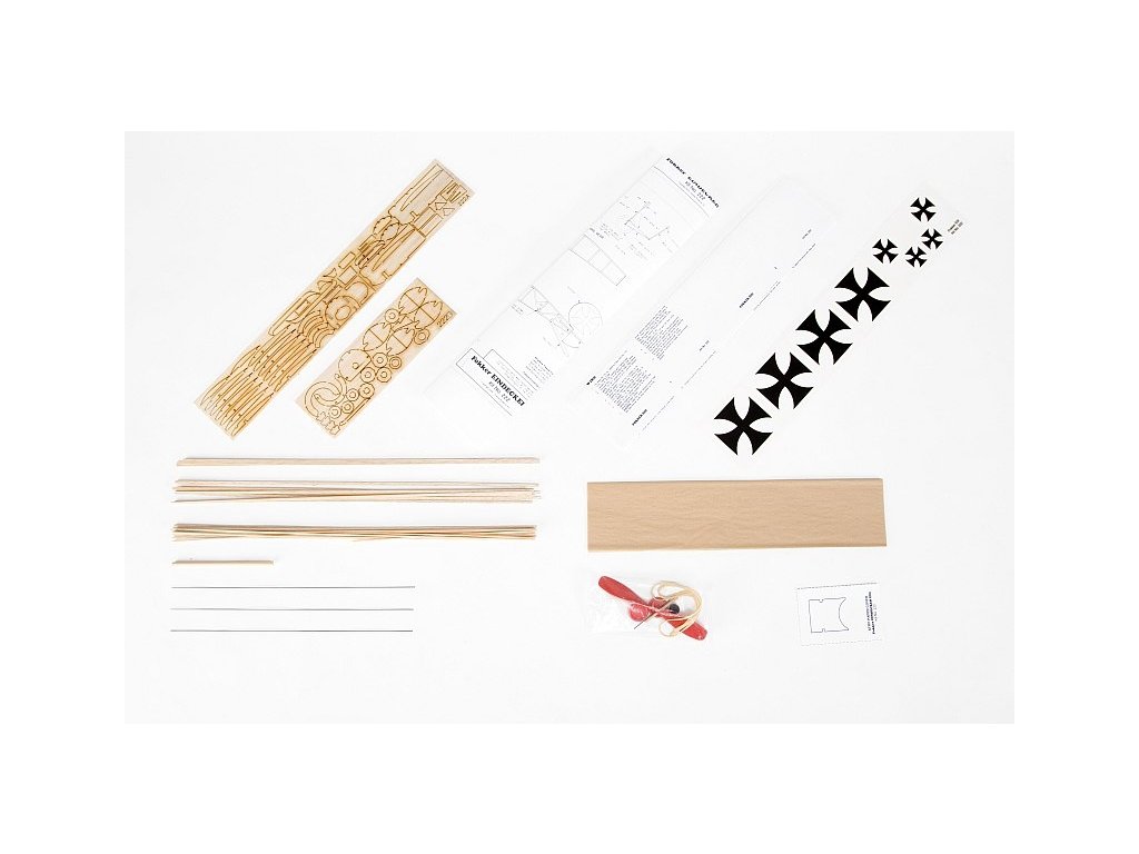 Stavebnice obsahuje: balsové laserem vyřezávané díly, balsové nosníky, vakuově lisované díly (kryt motoru, kryt kabiny...), plastovou vrtuli s hřídelí a hlavicí, gumový svazek (soutěžní guma FAI TAN II), kola, ocelovou strunu na podvozek a další drobné díly, barevný potahový papír, aršík samolepek, stavební plán.