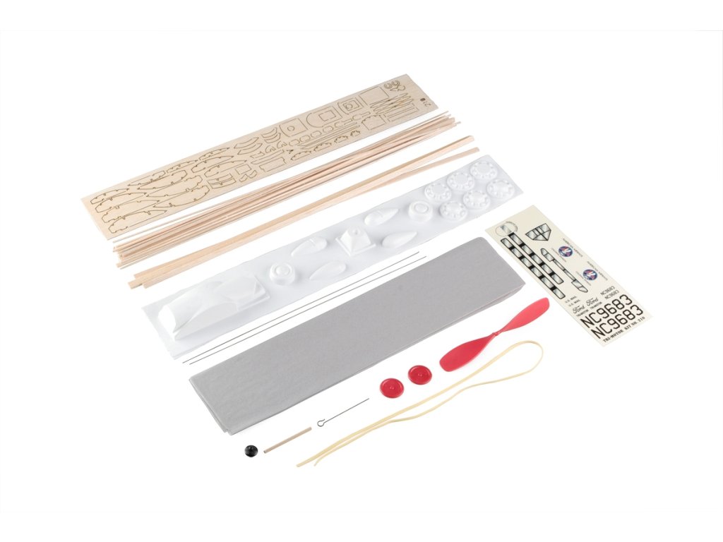 Stavebnice obsahuje: balsové laserem vyřezávané díly, balsové nosníky, vakuově lisované díly (kryt motoru, kryt kabiny...), plastovou vrtuli s hřídelí a hlavicí, gumový svazek (soutěžní guma FAI TAN II), kola, ocelovou strunu na podvozek a další drobné díly, barevný potahový papír, aršík samolepek, stavební plán.