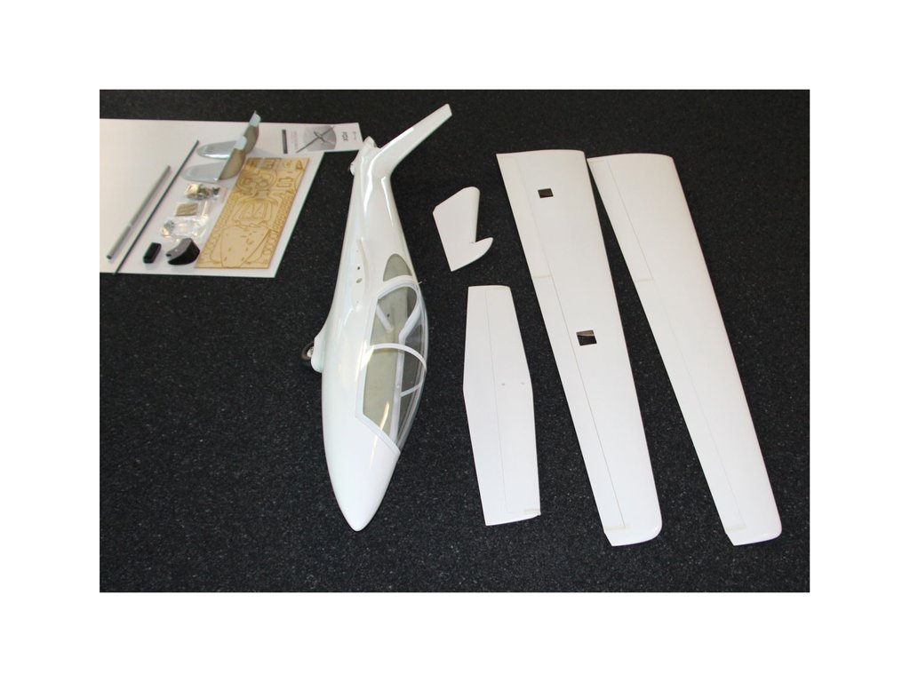 Laminátové bílé díly modelu: trup s nainstalovaným hlavním i ostruhovým kolem, křídlo P+L, výškovka, směrové kormidlo, hotová kabina, palubní deska, laminátové sedačky, spojka křídla, uhlíková trubička, uhlíková tyč, montážní příslušenství jako kovové vidličky s táhly, lože serv, překližkový výřez přepážek, kryty serv, lanko, drobné spojovací a montážní příslušenství a manuál DE, EN.