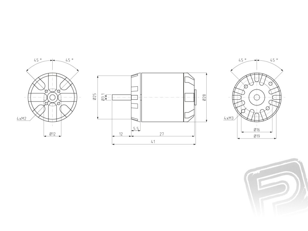 Montáž motoru: FOXY G3 C2208-1000 je konstruován pro přední i zadní montáž. Při přední montáži za čelo motoru použijte nejméně dva (protilehlé), nebo čtyři šrouby M3, které zasahují do čela motoru v rozmezí 3 - 4 mm. Páry otvorů pro upevňovací šrouby v čele motoru jsou rozmístěny pravidelně o 180° na kružnicích o průměru 16 a 19 mm. Motorová přepážka by měla být z 2 mm letecké překližky. Sada pro zadní montáž (upevňovací kříž, unašeč vrtule pro zadní motáž) je dodávána spolu s motorem.