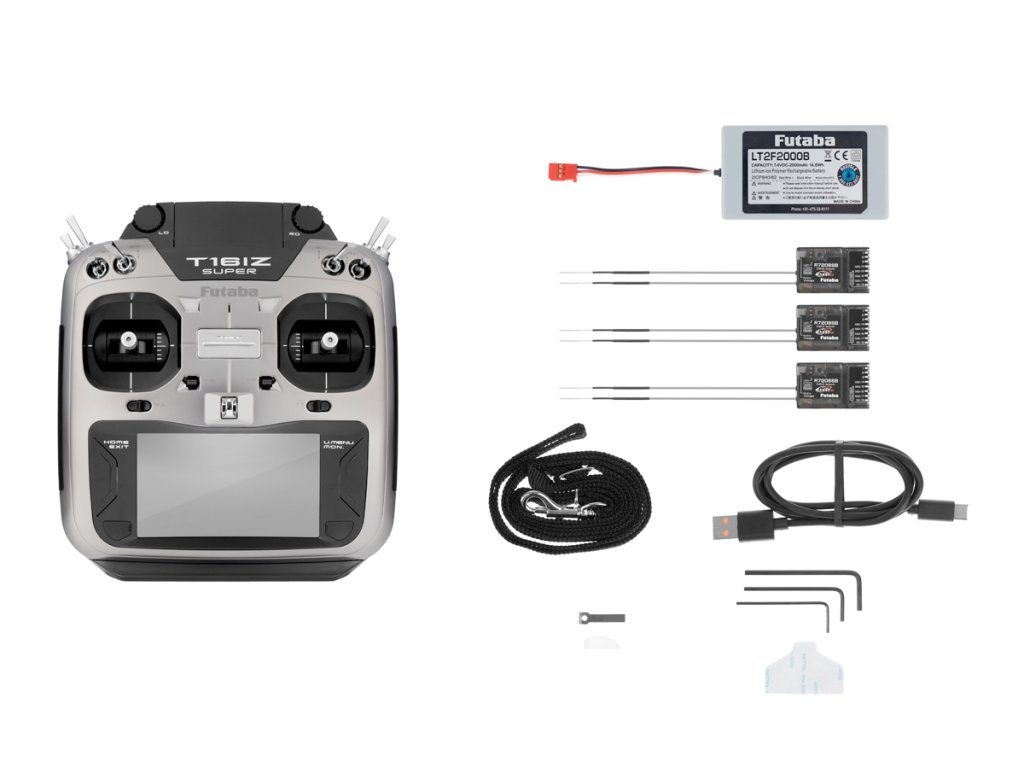 Vysílač T16IZ SUPER ve skříňce dokonale padnoucí do ruky je vybaven přesnými křížovými ovladači s nastavitelnou aretací/neutralizací, 8 přepínači, 2 posuvnými ovladači, 4 digitálními trimy a 2 otočnými proporcionálními ovladači. K programování slouží dvojice tlačítek a velký podsvícený barevný dotykový LCD displej zajišťující snadnou orientaci v intuitivním menu. T16IZ SUPER má paměť pro 30 modelů neomezeně rozšiřitelnou pomocí mikroSD karty a širokou škálu pokročilých mixových funkcí pro akrobatická letadla, větroně, vrtulníky a multikoptéry. Kromě zobrazení telemetrických dat na displeji je k dispozici hlasový výstup telemetrie v zásuvce pro sluchátko (není součástí soupravy). T16IZ SUPER je rovněž vybaven zásuvkou učitel-žák a zásuvkou pro programování a nastavování S.BUS serv a gyroskopických systémů CGY755/CGY760R nebo GYA553. USB datová zásuvka na horní straně vysílače možňuje používat T16IZ SUPER po připojení k PC USB kabelem jako ovladač pro RC simulátor bez potřeby dodatečného USB rozhraní.