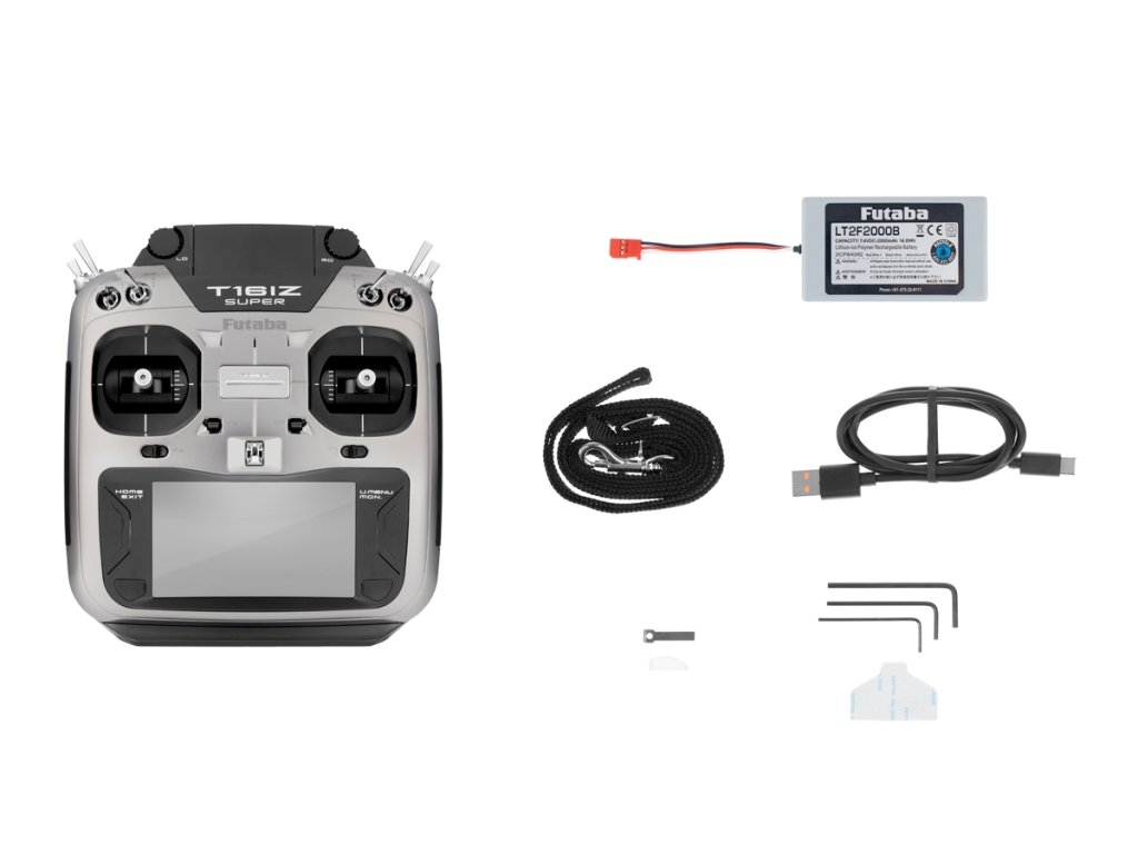 Vysílač T16IZ SUPER ve skříňce dokonale padnoucí do ruky je vybaven přesnými křížovými ovladači s nastavitelnou aretací/neutralizací, 8 přepínači, 2 posuvnými ovladači, 4 digitálními trimy a 2 otočnými proporcionálními ovladači. K programování slouží dvojice tlačítek a velký podsvícený barevný dotykový LCD displej zajišťující snadnou orientaci v intuitivním menu. T16IZ SUPER má paměť pro 30 modelů neomezeně rozšiřitelnou pomocí mikroSD karty a širokou škálu pokročilých mixových funkcí pro akrobatická letadla, větroně, vrtulníky a multikoptéry. Kromě zobrazení telemetrických dat na displeji je k dispozici hlasový výstup telemetrie v zásuvce pro sluchátko (není součástí soupravy). T16IZ SUPER je rovněž vybaven zásuvkou učitel-žák a zásuvkou pro programování a nastavování S.BUS serv a gyroskopických systémů CGY755/CGY760R nebo GYA553. USB datová zásuvka na horní straně vysílače možňuje používat T16IZ SUPER po připojení k PC USB kabelem jako ovladač pro RC simulátor bez potřeby dodatečného USB rozhraní.