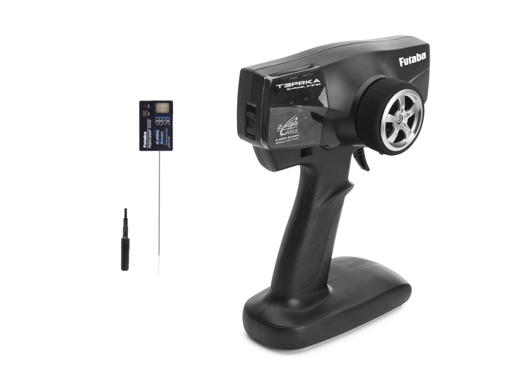Vysílač T3PRKA v klasickém volantovém designu s rukojetí dokonale padnoucí do ruky je vybaven volantovým ovladačem řízení, spouští pro ovládání plynu (vpřed/zpátečka 70:30), posuvným přepínačem pro třetí kanál a knoflíkem dvojích výchylek řízení na rukojeti. Pod odklopnou krytkou z průhledného plastu najdete 2 mechanické otočné trimy a přepínače smyslu výchylek pro kanály řízení a plynu a 2 knoflíky pro nastavení koncových bodů výchylek plynu.