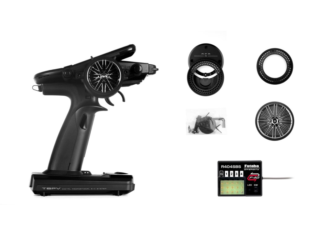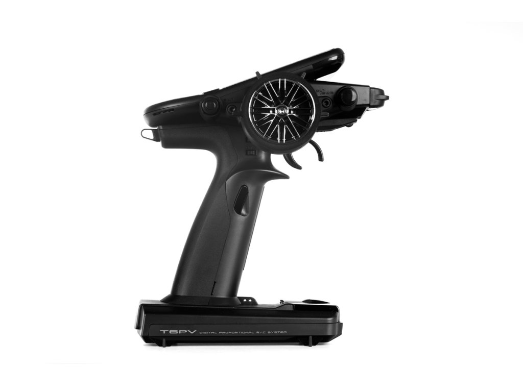 Vysílač T6PV v klasickém volantovém designu s rukojetí dokonale padnoucí do ruky je vybaven volantovým ovladačem řízení, spouští pro ovládání plynu, třemi tlačítkovými přepínači, jedním otočným ovladačem kombinovaným s tlačítkovým přepínačem a šesti digitálními trimy (4 okolo volantu, 2 na rukojeti). Volant i spoušť plynu mají bohaté možnosti mechanického nastavení pro dokonalé přizpůsobení vašim rukám a stylu řízení. K programování slouží pákový ovladač, čtveřice tlačítek a podsvícený barevný LCD displej s úhlopříčkou 3.2", zajišťující snadnou orientaci v intuitivním menu. T6PV má paměť pro 40 modelů neomezeně rozšiřitelnou pomocí mikroSD karty a širokou škálu pokročilých programových funkcí pro běžné i speciální modely aut - např. nezávislé řízení a pohon (se 2 regulátory) předních i zadních kol pro crawlery, dvojokruhové brzdy pro velké modely 1:5, gyro pro drifting, ABS, kontrola trakce, mix pro tanky apod.
