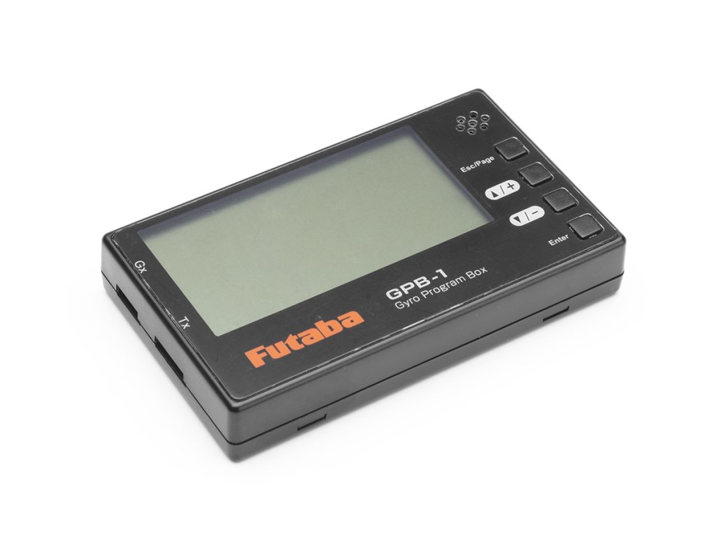 Inteligentní programátor s grafickým LCD displejem (128x64 bodů) pro nastavování gyroskopických systémů Futaba CGY 760, CGY 755 pro vrtulníky a GYA553 pro letadla. Nastavování je možné s přímým kabelovým připojením ke gyru (nastavení celého rozsahu parametrů) nebo bezdrátově pomocí systému učitel-žák při připojení ke kompatibilnímu vysílači Futaba (omezený rozsah parametrů). GPB-1 umožňuje rovněž nastavování S.BUS/S.BUS2 serv Futaba.
