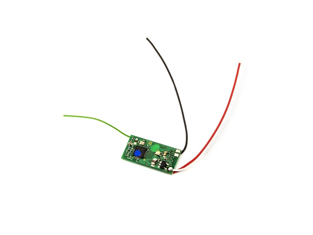 Přijímač je opatřen trojicí kablíků pro S.BUS výstup a napájení (+/-, S.BUS signál) a pájecími ploškami pro připojení signálových vodičů PWM výstupů pro klasická serva 1-6.