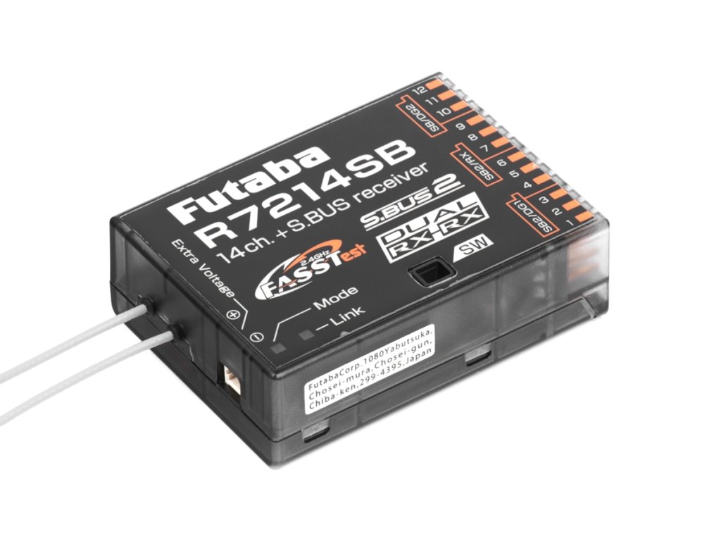 Čtrnáctikanálový telemetrický přijímač Futaba přenosového systému FASSTest-2.4GHz s dvojicí diverzitních antén s plným dosahem. Je určen pro všeobecné použití ve větších modelech všech kategorií. Díky volitelným kanálovým režimům a možnosti dvoupřijímačového provozu výborně poslouží i v modelech vyžadujících velký počet kanálů – v takovém případě dvojice R7214SB poskytne až 26 klasických PWM kanálových výstupů nebo 24 PWM výstupů a 2+2 S.BUS+S.BUS2 sériové porty. Kromě toho je přijímač vybaven portem S.BUS2 pro obousměrnou komunikaci umožňující připojení S.BUS2 serva, telemetrických čidel a dalších kompatibilních zařízení. Provozní stavy přijímače jsou signalizovány LED indikátorem.