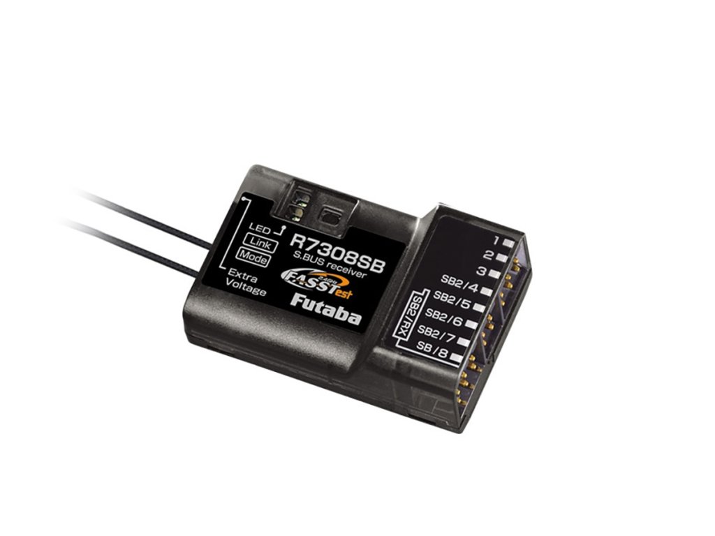 Osmikanálový telemetrický přijímač Futaba přenosového systému FASSTest-2.4GHz s dvojicí diverzitních antén s plným dosahem. Je určen pro všeobecné použití v modelech všech kategorií; díky kompaktním rozměrům, nízké hmotnosti a konektorům zasouvaným v podélné ose je vhodný i pro modely se štíhlým trupem, jako jsou větroně F3B, F3J apod. Díky volitelným kanálovým režimům a možnosti dvoupřijímačového provozu výborně poslouží i v modelech vyžadujících velký počet kanálů – v takovém případě dvojice R7308SB poskytne až 16 klasických PWM kanálových výstupů nebo 14-15 PWM výstupů a 1-2 S.BUS sériové výstupy. Kromě toho je přijímač vybaven portem S.BUS2 pro obousměrnou komunikaci umožňující připojení S.BUS2 serva, telemetrických čidel a dalších kompatibilních zařízení, jako S.BUS2 porty mohou sloužit také zásuvky kanálů 4-7. Provozní stavy přijímače jsou signalizovány LED indikátorem.