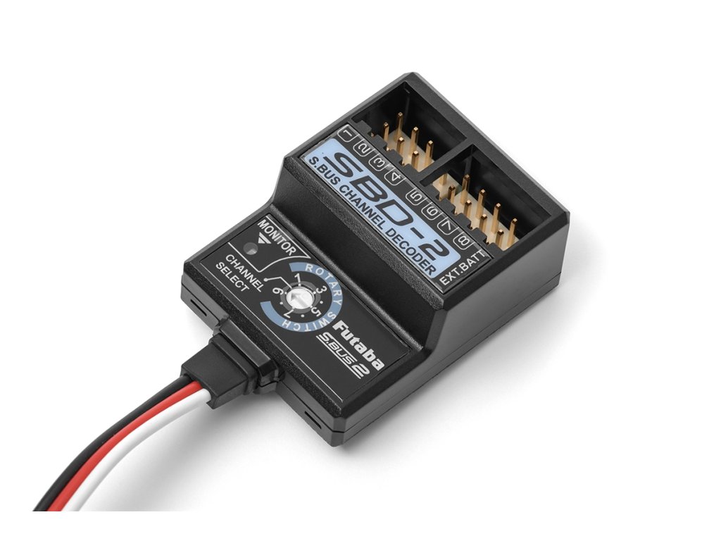 Osmikanálový dekodér S-BUS/S.BUS2 umožňující připojení až osmi klasických serv k sériové sběrnici S-BUS nebo S.BUS2, vhodný pro analogová i digitální serva s napájením 4,8-7,4 V (4-6čl. NiMH, 2S LiPo, LiFe). Dekodér a serva mohou být napájena z přijímače nebo ze zvláštního akumulátoru zapojeného do dekodéru. Činnost dekodéru je signalizována LED diodou.