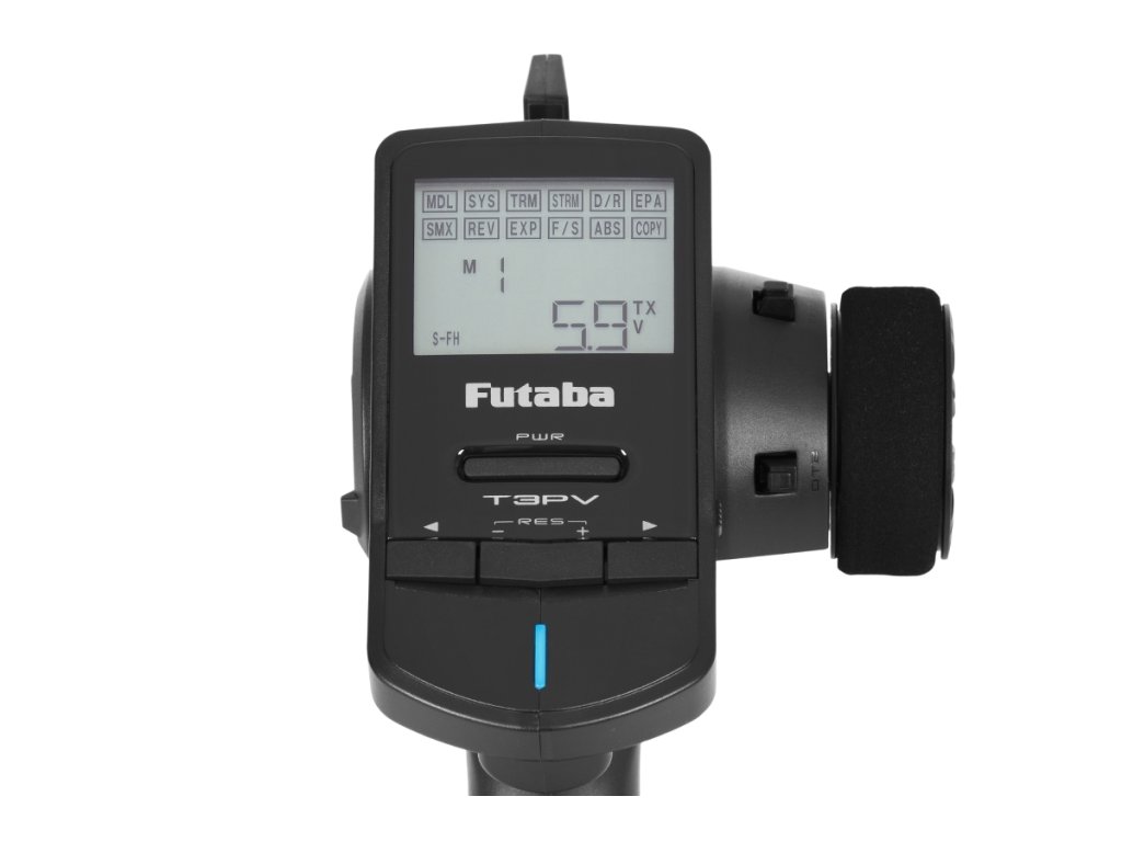 Vysílač T3PV v klasickém volantovém designu s rukojetí dokonale padnoucí do ruky je vybaven volantovým ovladačem řízení, spouští pro ovládání plynu, posuvným přepínačem pro třetí kanál a třemi digitálními trimy okolo volantu (DT3 může sloužit k proporcionálnímu ovládání 3. kanálu). K programování slouží čtveřice tlačítek; snadnou orientaci v intuitivním menu zajišťuje velký LCD displej. T3PV má paměť pro 10 modelů a širokou škálu programových funkcí pro běžné i speciální modely aut (např. řízená přední i zadní kola pro crawlery, dvouokruhové brzdy pro velké modely 1:5 apod.).