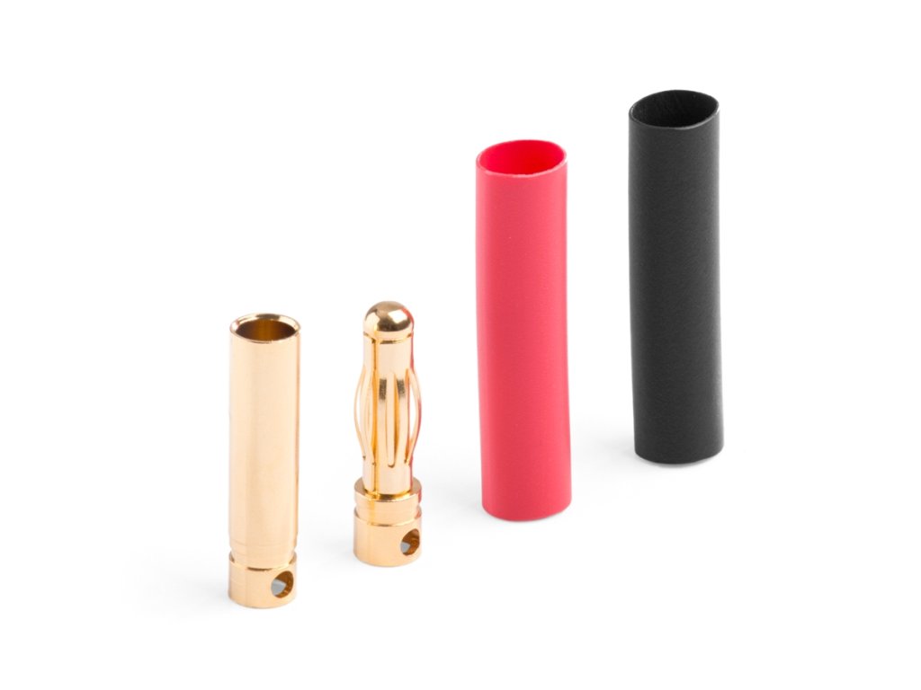 Silový zlacený konektor 4 mm s pružinovým kolíčkem se zatížitelností max. 70A (dlouhodobě 32A). Pro kabely o průřezu max. 2,6 mm2 (13AWG). Přechodový odpor 0,45 mOhm, max. 500 V. Balení 100 párů kolíček/dutinka se smršťovací bužírkou.