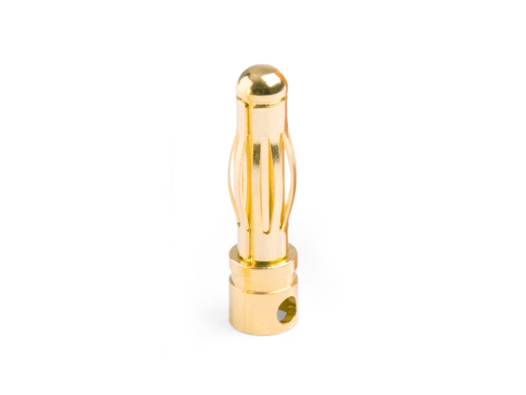 Silový zlacený konektor 4 mm s pružinovým kolíčkem se zatížitelností max. 70A (dlouhodobě 32A). Pro kabely o průřezu max. 2,6 mm2 (13AWG). Přechodový odpor 0,45 mOhm, max. 500 V. Balení 10 kusů Samců / Kolíků.