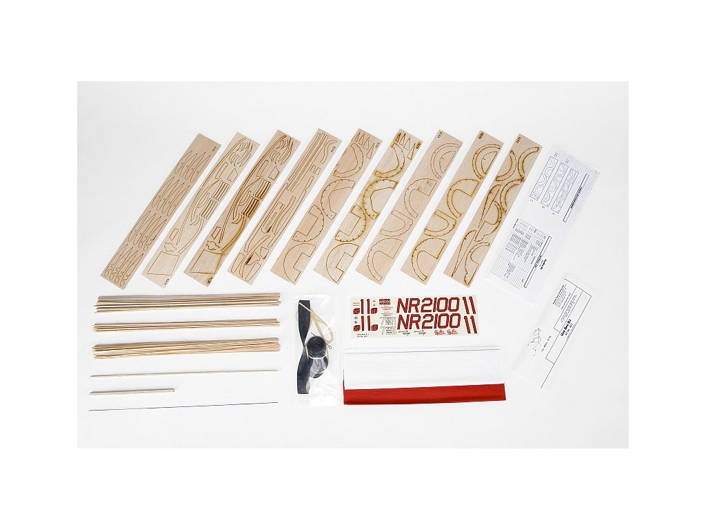 Stavebnice obsahuje: balsové laserem vyřezávané díly, balsové nosníky, vakuově lisované díly (kryt motoru, kryt kabiny...), plastovou vrtuli s hřídelí a hlavicí, gumový svazek (soutěžní guma FAI TAN II), kola, ocelovou strunu na podvozek a další drobné díly, barevný potahový papír, aršík samolepek, stavební plán.
