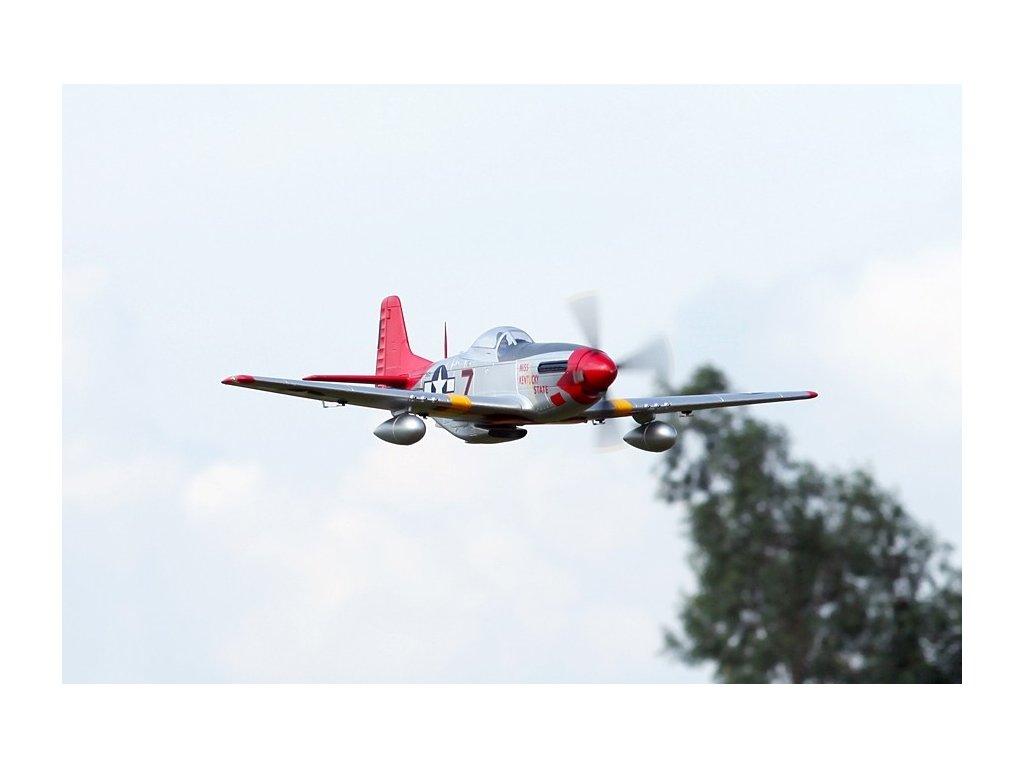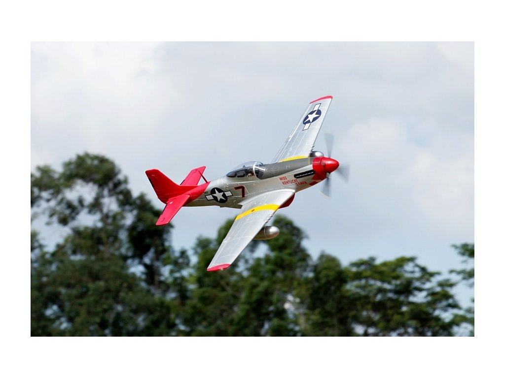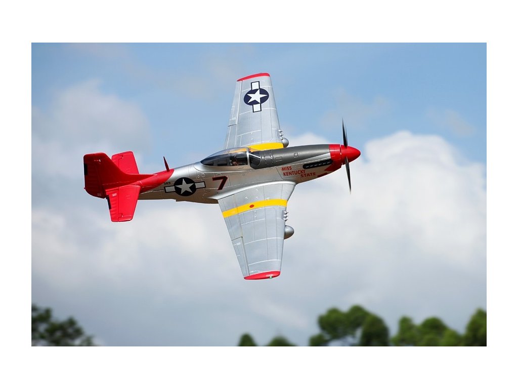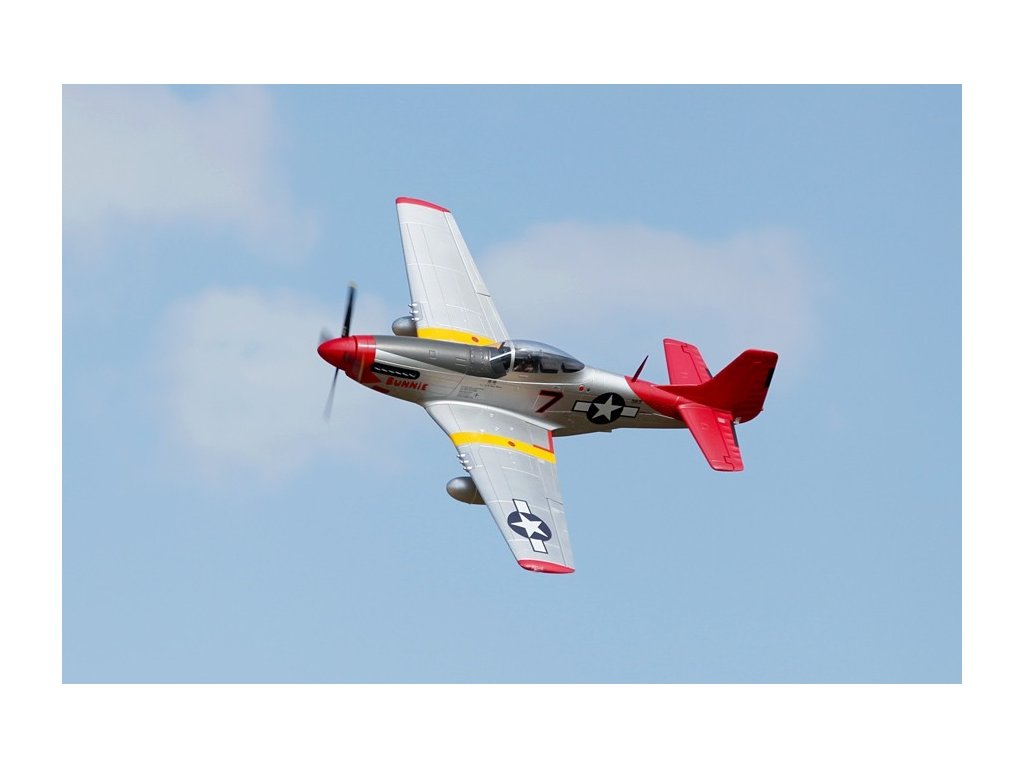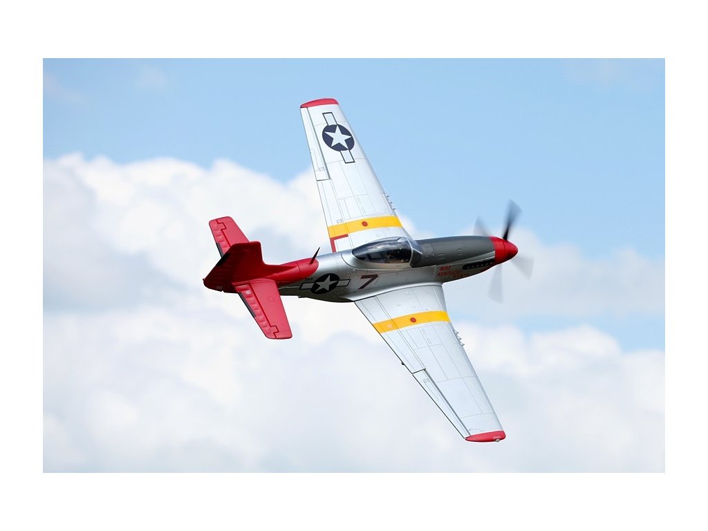 - Autentický design: Model je detailně zpracovaný s realistickými prvky včetně kokpitu, výsuvného podvozku, funkčních klapek a LED navigačních světel. Věrně zachycuje vzhled skutečného P-51D Mustang.