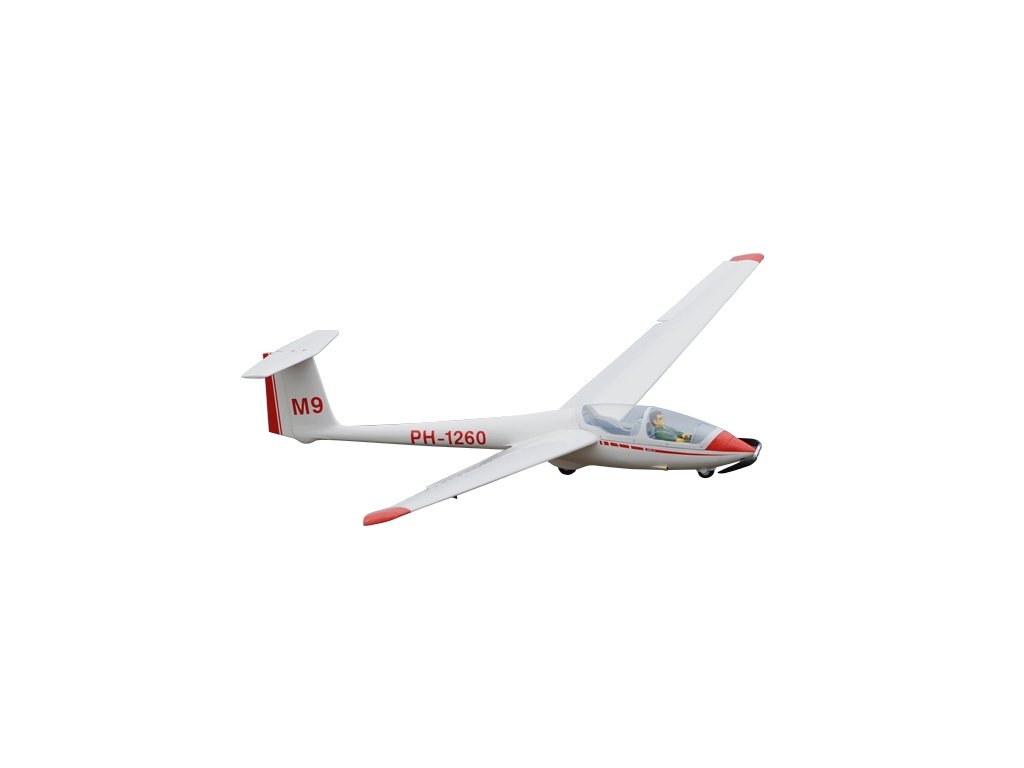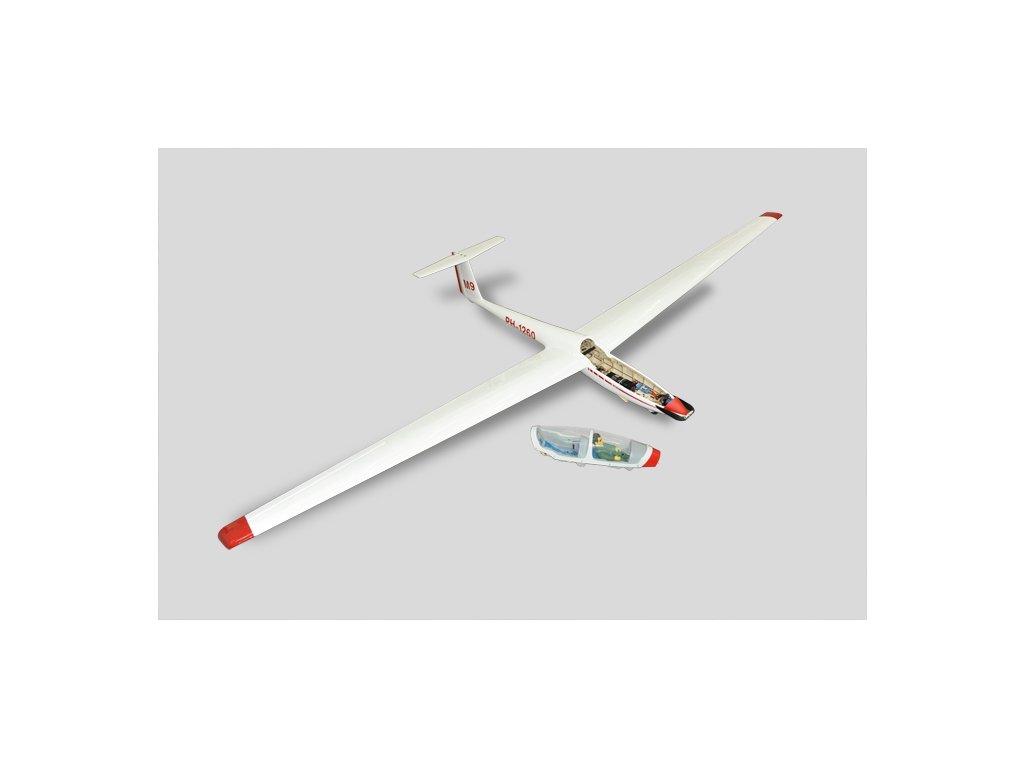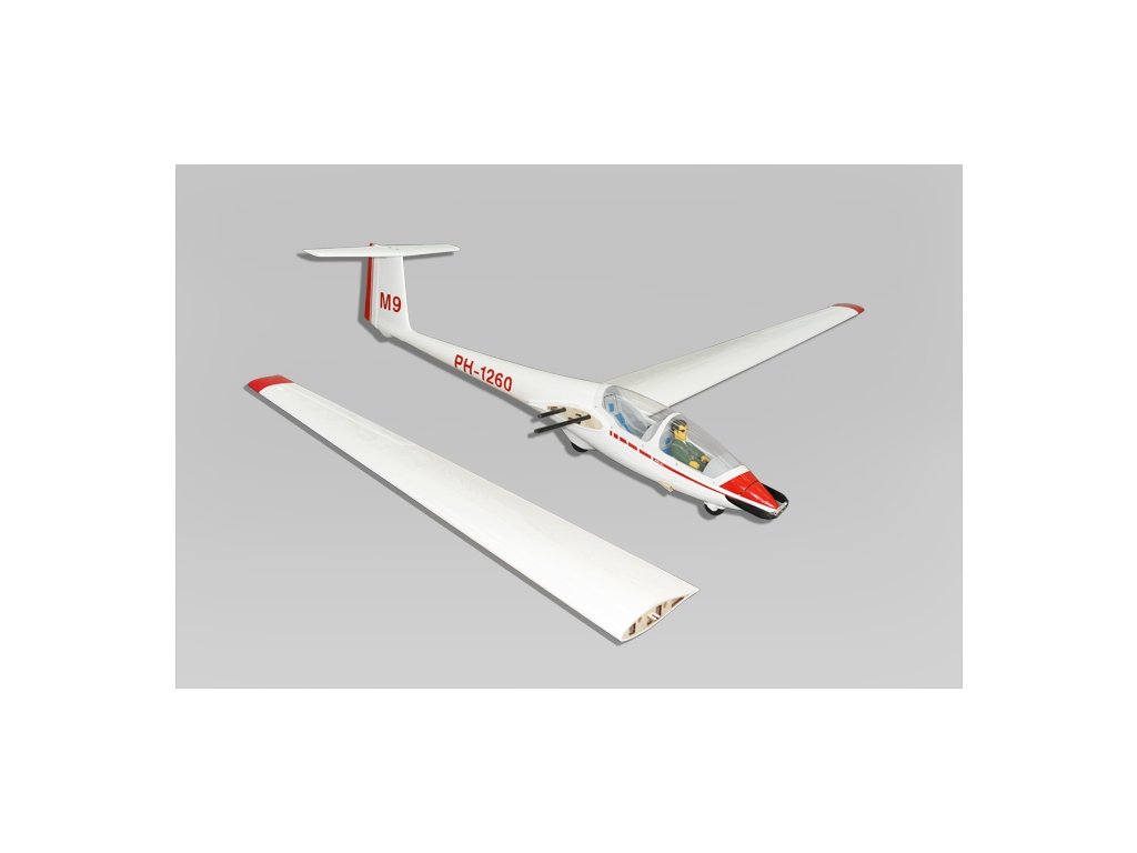 Dvoudílné křídlo nasouvané z boku na dvě spojky z duralových trubek je klasické konstrukce s torzní skříní s balsovým tuhým potahem a potahem nažehlovací fólií Oracover. Křidélka jsou ovládána párem serv s krátkými přímými táhly; realisticky tlustý profil křídla (z řady HQ) s klenutou střední křivkou dává dostatek prostoru pro použití běžných mikroserv. křídlo je připraveno pro instalaci elektricky ovládaných aerodynamických brzd systému Schempp-Hirth o délce 450 mm.