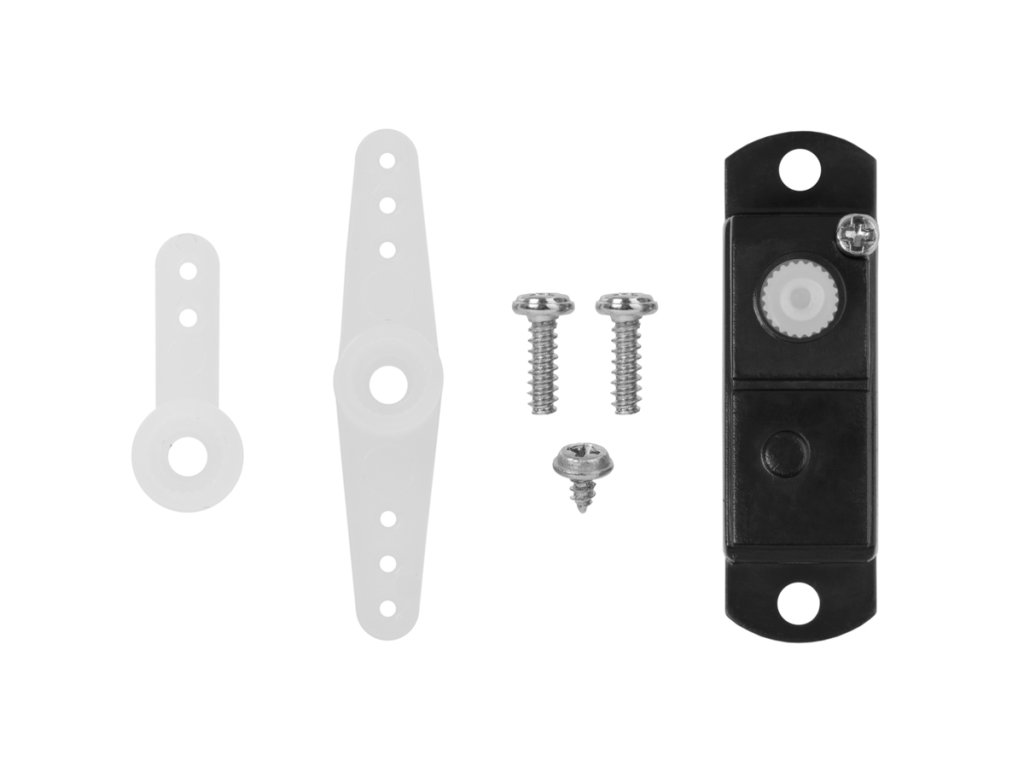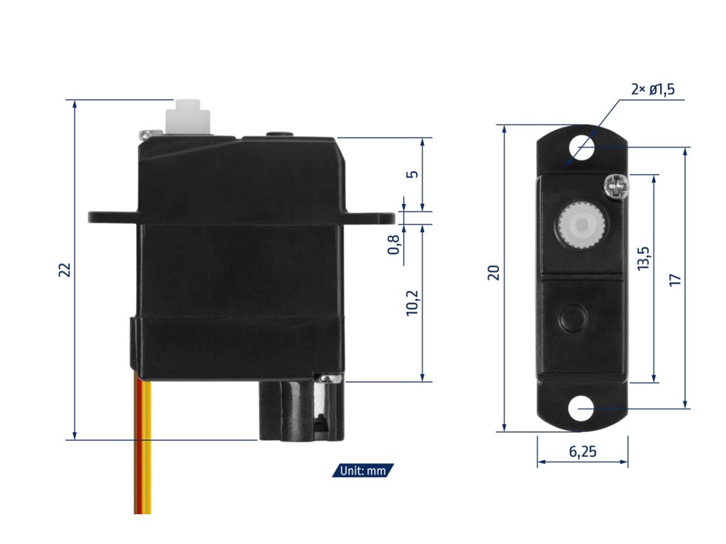 Mikroservo 1,8g s plastovými převody pro malé elektrolety a větroně. Tah 0,06 kg/cm, rychlost 0,07s/60st při 3,5 V, tah 0,08 kg/cm, rychlost 0,05s/60st při 5,0 V, rozměry 13,5x6,2x16 mm, napájení 3,5-5,0V.Doplňkové parametry