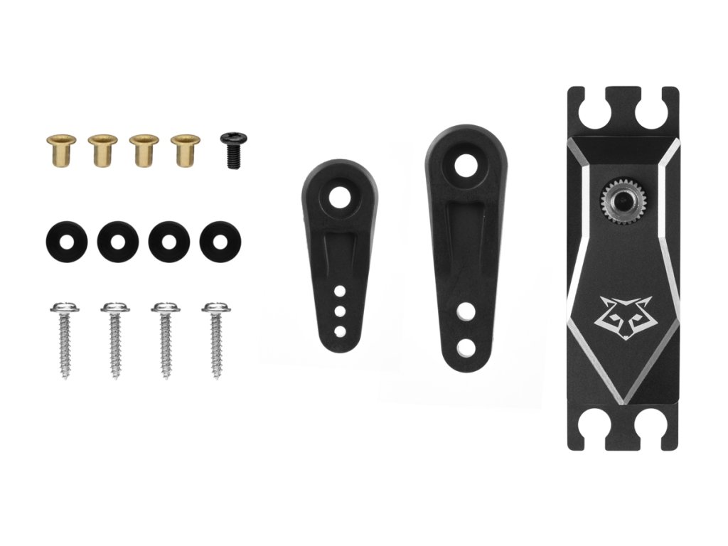 Silné a velmi rychlé úzkopásmové digitální standardní servo 41g se střídavým (brushless) motorem s titanovými převody a výstupní hřídelí uloženou na dvou kuličkových ložiscích pro použití jako servo vyrovnávacího rotoru v RC vrtulnících 380-500. Pro dokonalé chlazení i při vysokém zatížení je servo uloženo v hliníkové krabičce.