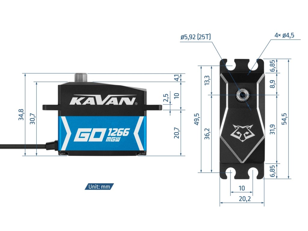 Super silné a rychlé vodotěsné nízkoprofilové programovatelné digitální standardní servo se střídavým motorem, ocelovými převody s výstupní hřídelí uloženou na dvou kuličkových ložiscích pro použití v RC modelech všech typů; ideální pro terénní RC auta 1:8/1:10, lodě a podobné náročné aplikace stejně jako pro modely ledadel i vrtulníků. Pro dokonalé chlazení i při vysokém zatížení a ochranu vůči nepříznivým vlivům okolního prostředí je servo uloženo ve vodotěsné/prachotěsné (standard IP67) hliníkové krabičce se střední částí tvořenou profilovým chladičem.