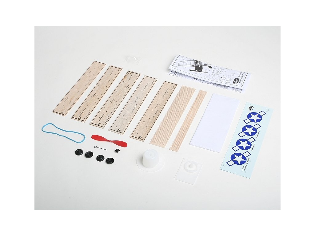 Stavebnice obsahuje: balsové předseknuté díly, balsové nosníky, vakuově lisované díly (kryt motoru, kryt kabiny...), plastovou vrtuli s hřídelí a hlavicí, gumový svazek, kola, ocelovou strunu na podvozek a další drobné díly, potahový papír, aršík mokrých obtisků, stavební plán.
