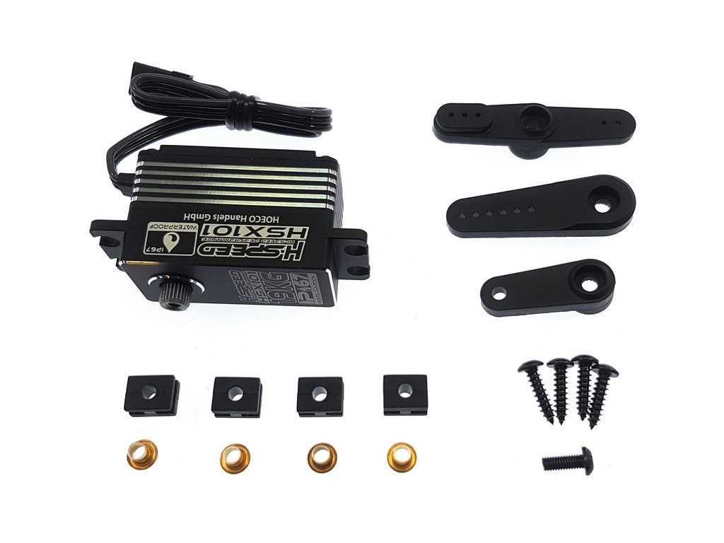 Balení obsahuje servo HSX101, prodlužovací servo kabel, 3x páku serva (jednostranná R - 30mm, jednostranná R - 18mm, dvoustranná D - 38mm), šroub páky, 4x silentblok s kovovu vložkou, 4x šroub pro uchycení serva.