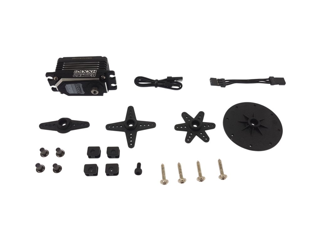 Balení obsahuje servo HXX101, 2x kabel serva (50 mm a 150 mm), 4x páka serva (dvoustranná D - 39mm, čtyřstranná D - 39 mm, šestistranná D - 33 mm, kruhová 45 mm), šroub páky, 4x silentblok s kovovu vložkou, 4x šroub pro uchycení serva.