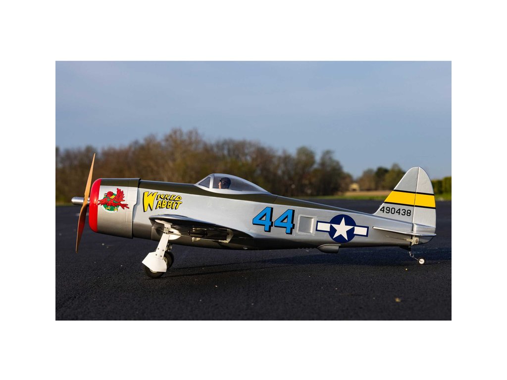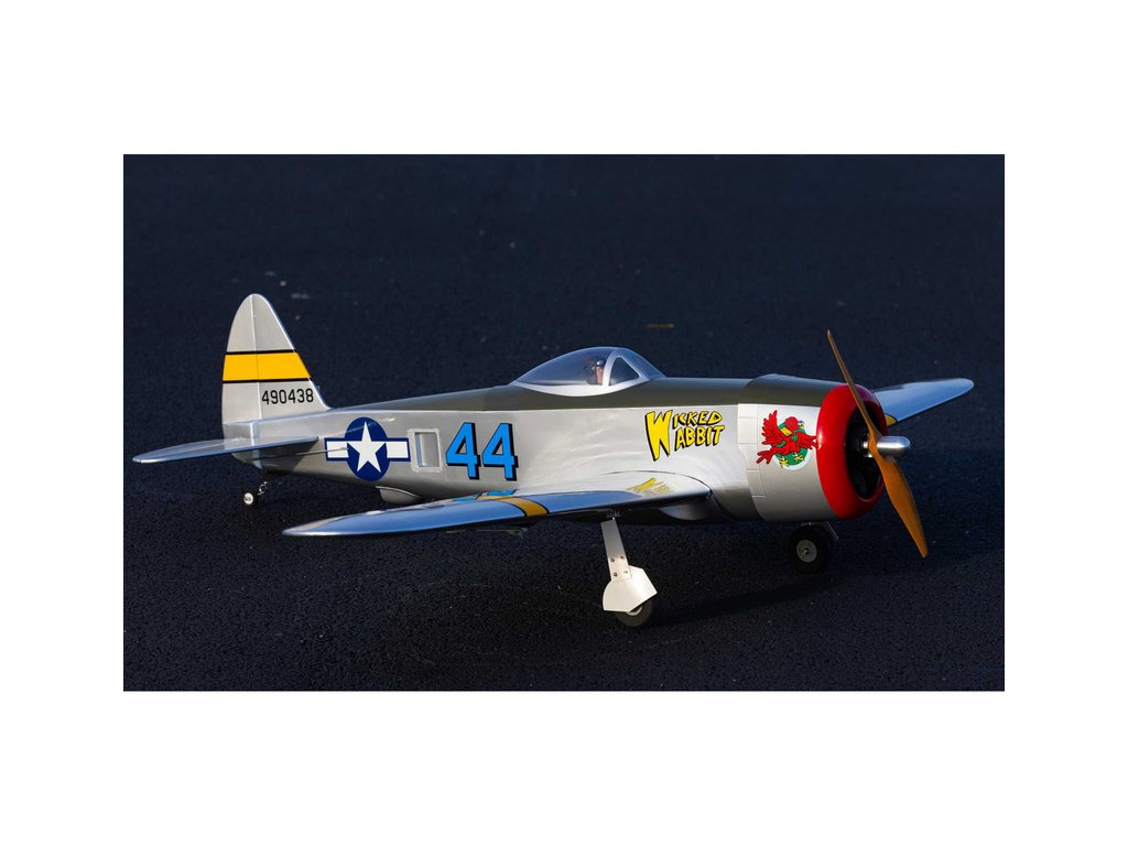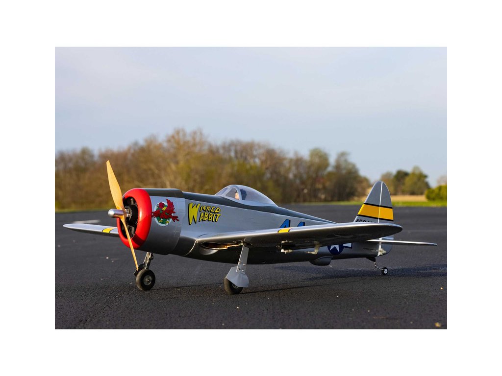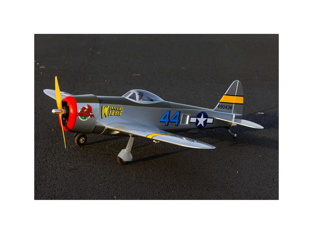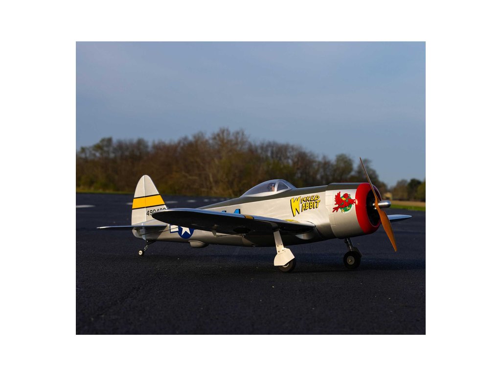 Hangar 9 nabízí celodřevěný, prakticky vybavený a téměř hotový RC model P-47 Thunderbolt, který je standardní stavebnicí, kterou je potřeba sestavit podle návodu. Výhodou je vybavenost modelu pohonem, serva a elektrickým zatahovacím podvozkem. Lehká celodřevěná konstrukce je převážně z překližky a balzy, díly jsou potaženy nažehlovací fólií UltraCote®. Při sestavení musí nalepit výškovka, nainstalovat táhla a zkompletovat křídlo, které se poutá pomocí dvou šroubů a kolíku k trupu. Přiložené dvě sady obtisků vám nabízí vyzdobit svůj model v kamufláži „Wicked Wabbit“ nebo „Hun Hunter“. Kryt motoru je laminátový nabarvený, snadno odnímatelný a usnadní přístup k elektronice a bateriím. V balení je obsažena dřevěná vrtule 14x12 pro napájení 4 čl. Lipo baterií.