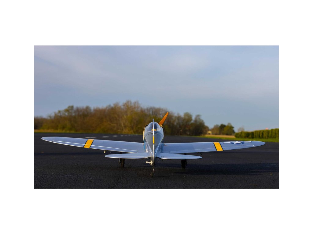 RC model warbirdu od Hangar 9, letadlo P-47 Thunderbolt o rozpětí 1.5 m ve verzi PNP s nainstalovaným motorem, regulátorem, servy, vrtulí a zatahovacím podvozkem. Celodřevěná konstrukce, potah Ultracote, stačí nainstalovat pouze váš přijímač s baterií.