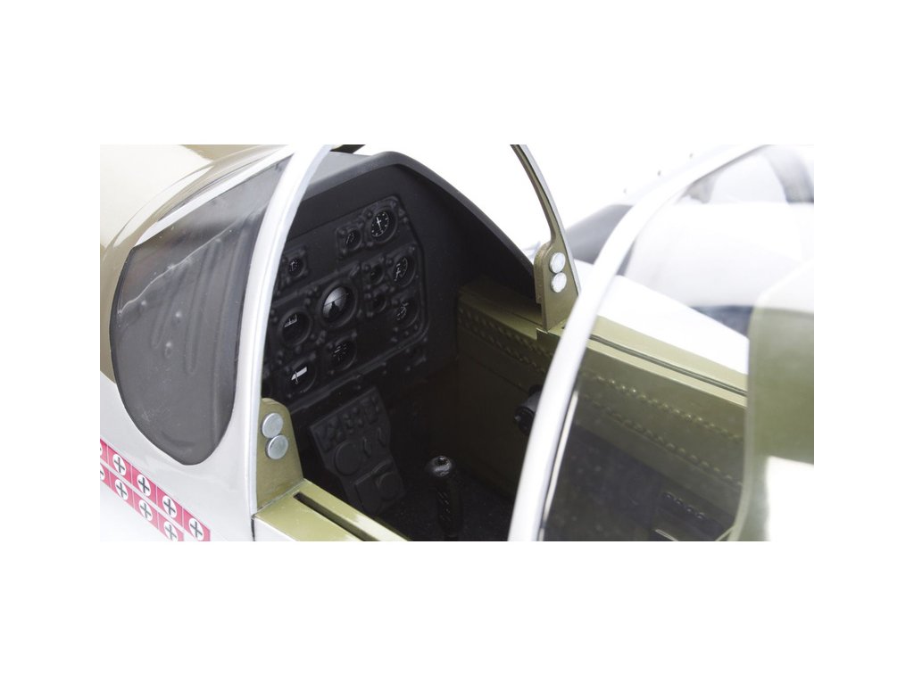 Přístrojová deska vypadá díky 3D výlisku velmi věrně, skládá se z několika částí. Součástí kokpitu jsou i boční panely, sedačka pro pilota a další maketové detaily.