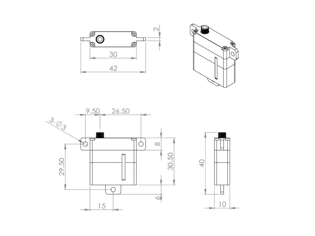 Velmi silné a rychlé programovatelné tenké digitální miniservo se střídavým motorem a titanovými převody uloženými na dvou kuličkových. Díky přesným předepjatým převodům s minimálními vůlemi a ploché krabičce s výškou 10 mm je zvláště vhodné pro ovládání křidélek a klapek ve větroních (F3B, F3F, F3J, F5J apod.) a motorových modelech s tenkými profily křídla/ocasních ploch. Pro dokonalé chlazení i při vysokém zatížení je servo uloženo v hliníkové krabičce s patkami pro montáž na plocho.