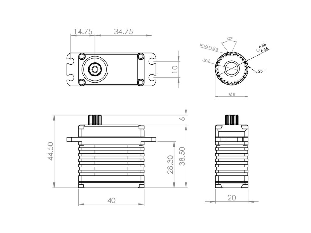 Silné a ultra rychlé úzkopásmové (760µs) digitální standardní servo se střídavým motorem, kovovými převody a výstupní hřídelí uloženou na dvou kuličkových ložiscích. Ideální pro vyrovnávací rotory vrtulníků velikosti 700-800, kompatibilní s většinou 760µs gyroskopů a flybarless jednotek. Pro dokonalé chlazení i při velmi vysokém zatížení je servo uloženo v hliníkové krabičce se žebrovanou střední částí. Servo není programovatelné.