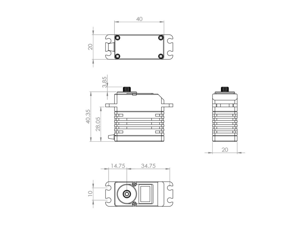 Ultra rychlé úzkopásmové (760µs) digitální standardní servo se střídavým motorem, kovovými převody a výstupní hřídelí uloženou na dvou kuličkových ložiscích. Ideální pro vyrovnávací rotory vrtulníků velikosti 600-800, kompatibilní s většinou 760µs gyroskopů a flybarless jednotek. Pro dokonalé chlazení i při velmi vysokém zatížení je servo uloženo v hliníkové krabičce se žebrovanou střední částí. Servo není programovatelné.