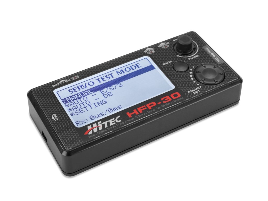 Kapesní programátor pro VŠECHNA PROGRAMOVATELNÁ SERVA HITEC. To znamená, že s HFP-30 můžete programovat digitální serva nové řady Dxxx, střídavá serva HSB-9xxx i digitální serva řady HS-5xxx a HS-7xxx. Díky velkému LCD displeji, intuitivnímu menu a ovládání 3D kolečkem máte k dispozici nástroj s jednoduchou a komfortní obsluhou pro programování a testování serv v dílně i na letišti.