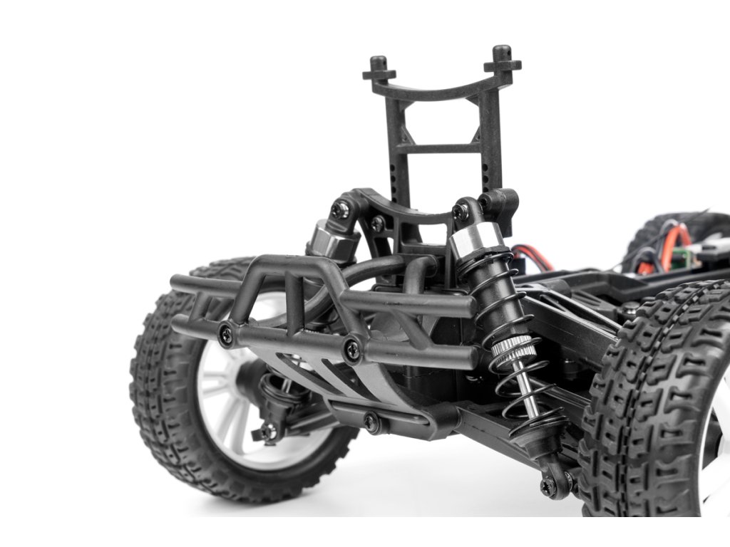 Podvozek má nezávislé zavěšení kol a horní ramena i spojovačky řízení jsou vybaveny spojovačkami s šestihranem a pravo/levým závitem pro snadné nastavení a seřízení geometrie podvozku. Jistotu a stabilitu při jízdě modelu dodávají olejové tlumiče.