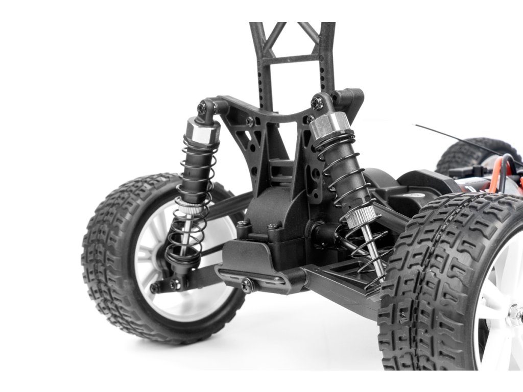 Podvozek má nezávislé zavěšení kol a horní ramena i spojovačky řízení jsou vybaveny spojovačkami s šestihranem a pravo/levým závitem pro snadné nastavení a seřízení geometrie podvozku. Jistotu a stabilitu při jízdě modelu dodávají olejové tlumiče.