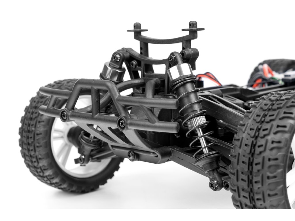 Podvozek má nezávislé zavěšení kol a horní ramena i spojovačky řízení jsou vybaveny spojovačkami s šestihranem a pravo/levým závitem pro snadné nastavení a seřízení geometrie podvozku. Jistotu a stabilitu při jízdě modelu dodávají olejové tlumiče.
