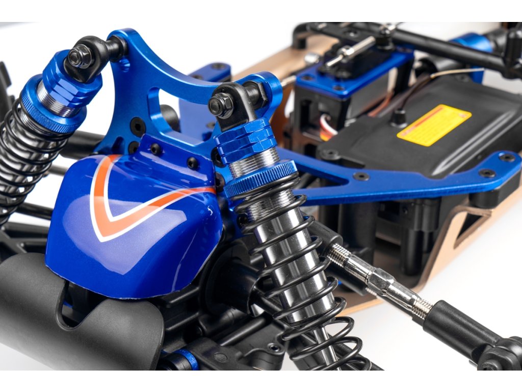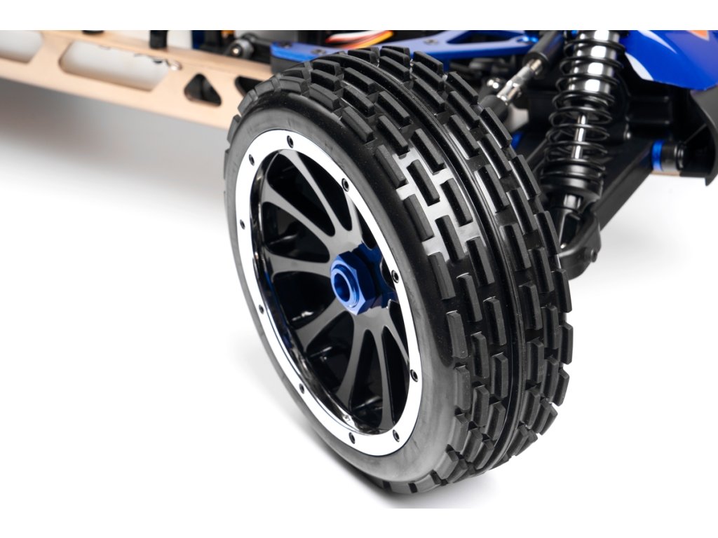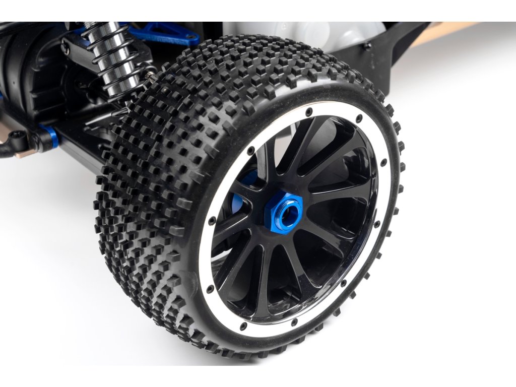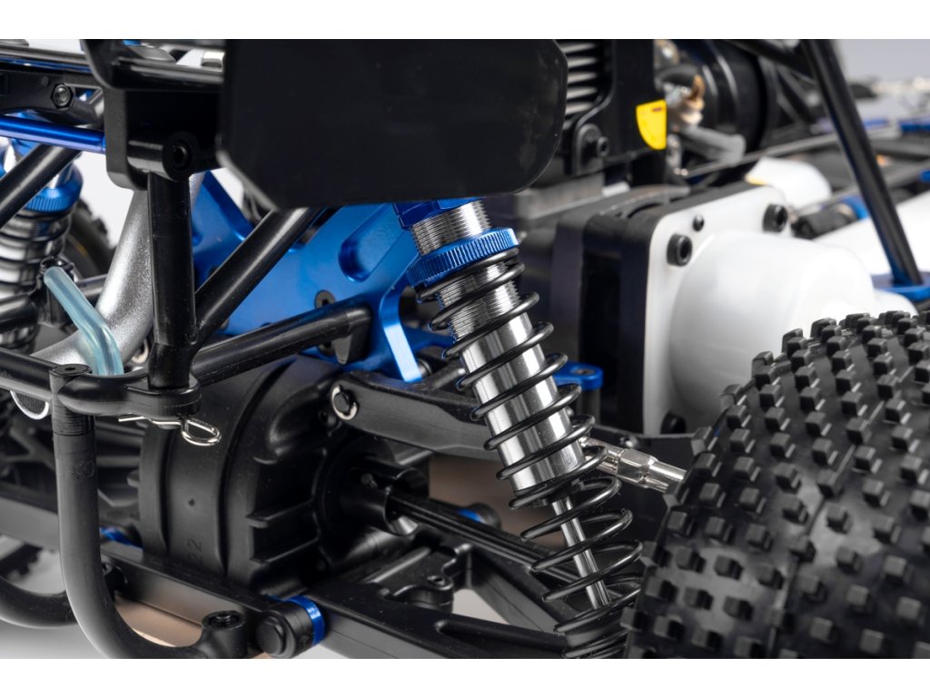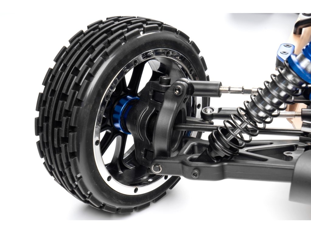 Veškeré spojovací tyče (svorníky ramen apod.) jsou ocelové o průměru 7mm vybavené pravo-levým závitem a šestihranem, což umožňuje pohodlné a přesné nastavení geometrie podvozku. O odpružení se stará čtveřice celokovových olejových tlumičů s vinutými pružinami. Předpětí pružiny je jednoduše nastavitelné pomocí matice s jemným závitem. Modře eloxované držáky tlumičů (parohy) jsou vyrobeny z 8mm silného!!! duralu. Ráfky kol jsou vybaveny šroubovaným límcem, který zajišťuje pneumatiku bez nutnosti lepení. Nízkoprofilové pneumatiky mají osvědčený "buggynový" vzorek a mají průměr 178mm. Bezpečně zastavit tento model to už chce sílu a proto je použita dvojitá kotoučová brzda.