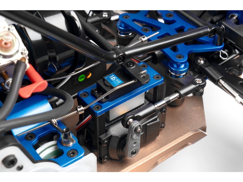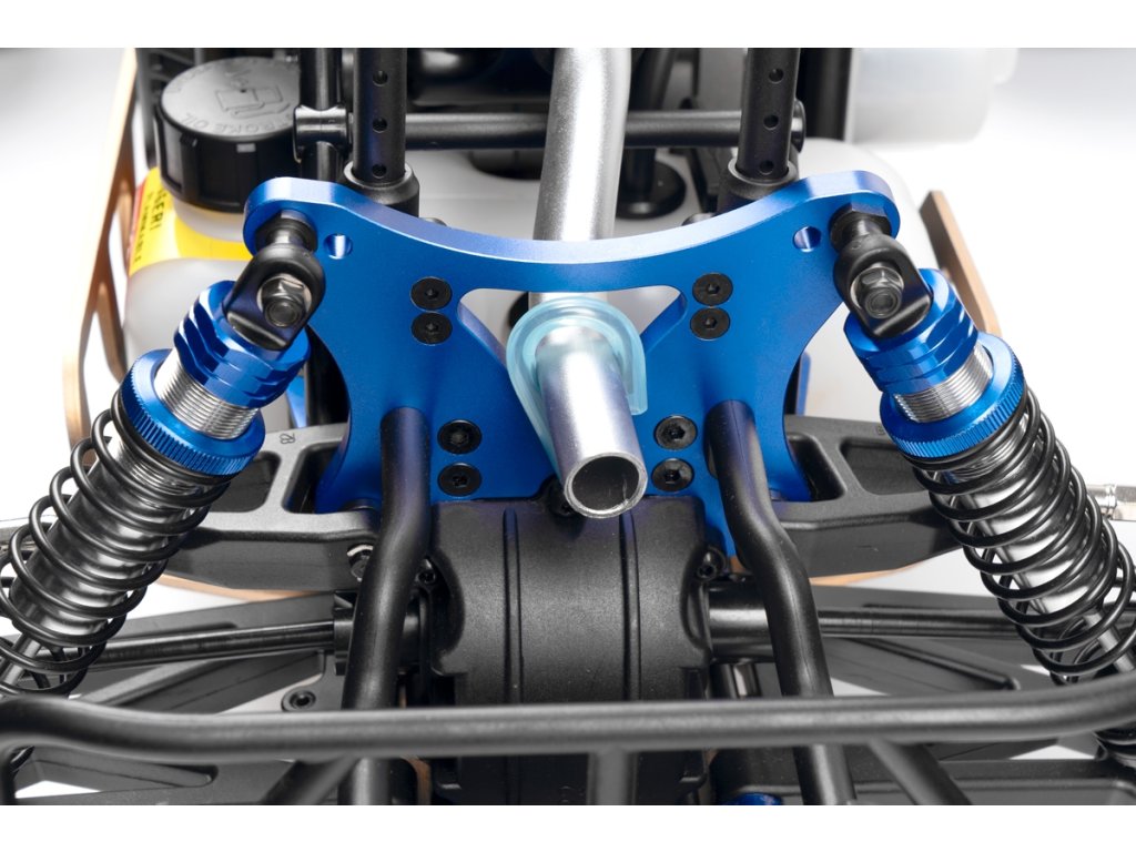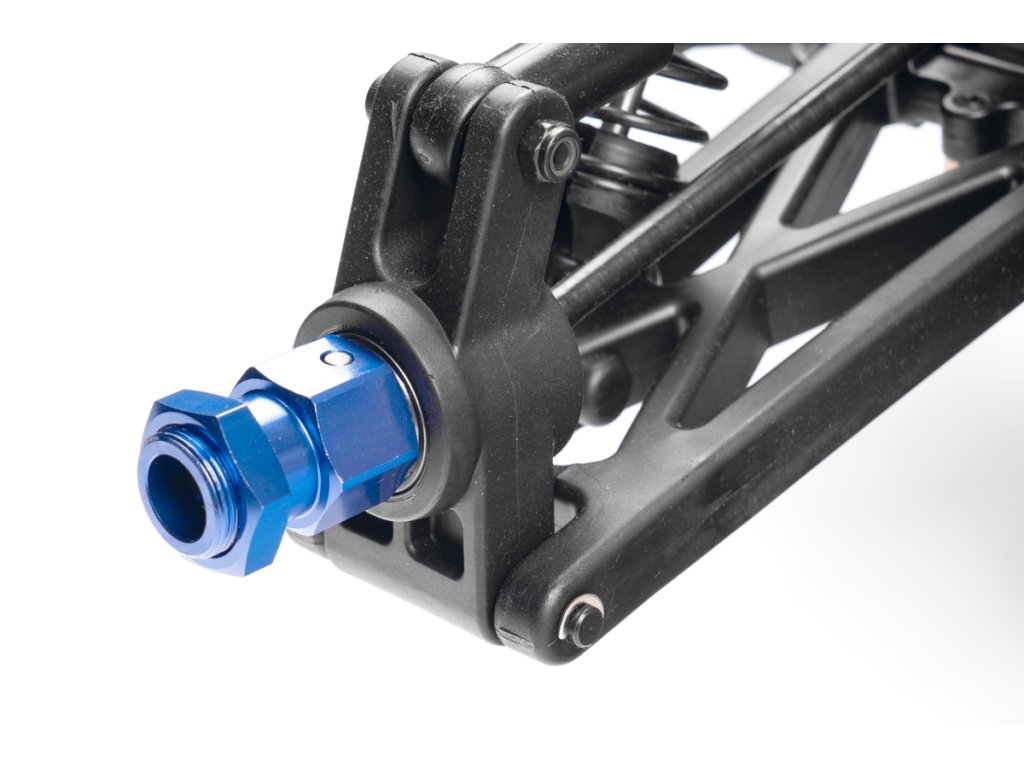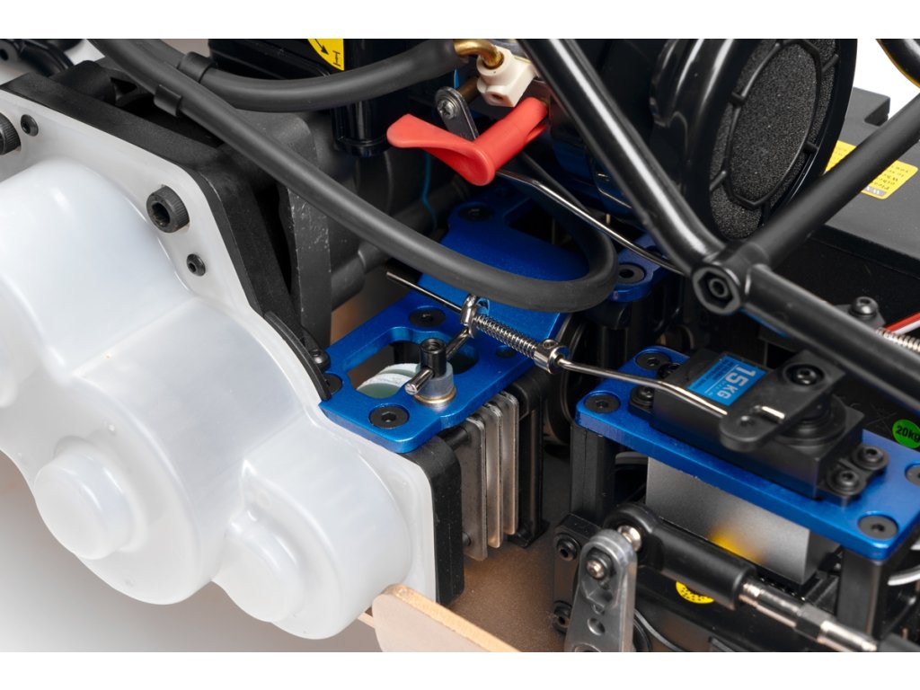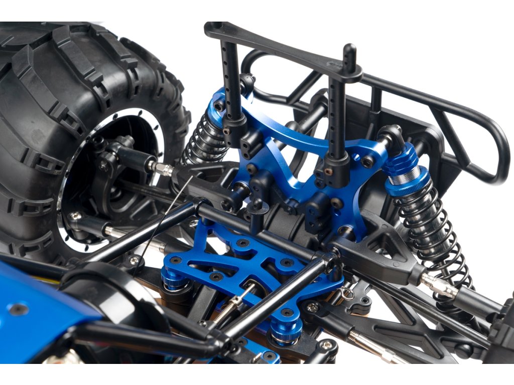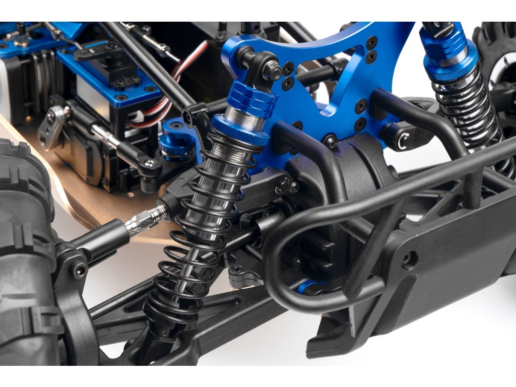 Veškeré spojovací tyče (svorníky ramen apod.) jsou ocelové o průměru 7mm vybavené pravo-levým závitem a šestihranem, což umožňuje pohodlné a přesné nastavení geometrie podvozku. O odpružení se stará čtveřice celokovových olejových tlumičů s vinutými pružinami. Předpětí pružiny je jednoduše nastavitelné pomocí matice s jemným závitem. Modře eloxované držáky tlumičů (parohy) jsou vyrobeny z 8mm silného!!! duralu. Ráfky kol jsou vybaveny šroubovaným límcem, který zajišťuje pneumatiku bez nutnosti lepení. Nízkoprofilové pneumatiky mají osvědčený "buggynový" vzorek a mají průměr 178mm. Bezpečně zastavit tento model to už chce sílu a proto je použita dvojitá kotoučová brzda.