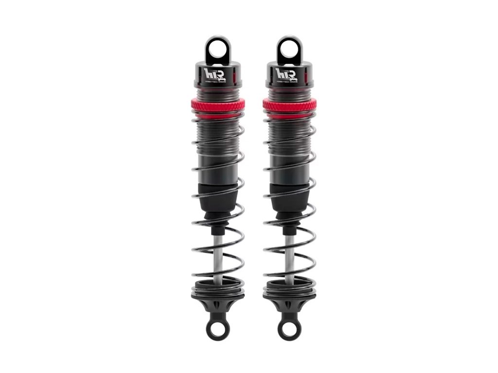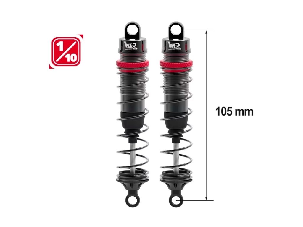 Celohliníkové olejové tlumiče pro modely 1/10 a podobné, Celková délka mezi čepy je 105mm, průměr pístku je 13mm. Sada obsahuje: tři páry pružin: měkké, střední a tvrdé; horní i spodní upevňovací materiál.Doplňkové parametry