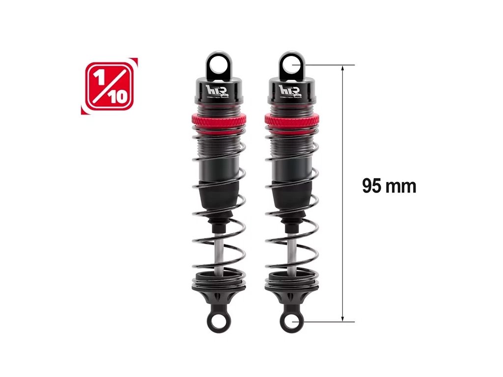 Celohliníkové olejové tlumiče pro modely 1/10 a podobné, Celková délka mezi čepy je 95mm, průměr pístku je 13mm. Sada obsahuje: tři páry pružin: měkké, střední a tvrdé; horní i spodní upevňovací materiál.Doplňkové parametry