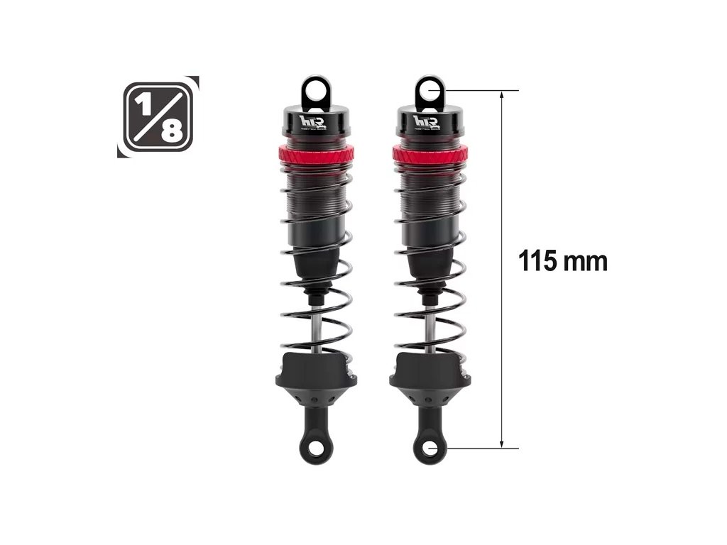 Celohliníkové olejové tlumiče pro modely 1/8 a podobné, Celková délka mezi čepy je 115mm, průměr pístku je 16mm. Sada obsahuje: tři páry pružin: měkké, střední a tvrdé; horní i spodní upevňovací materiál.Doplňkové parametry