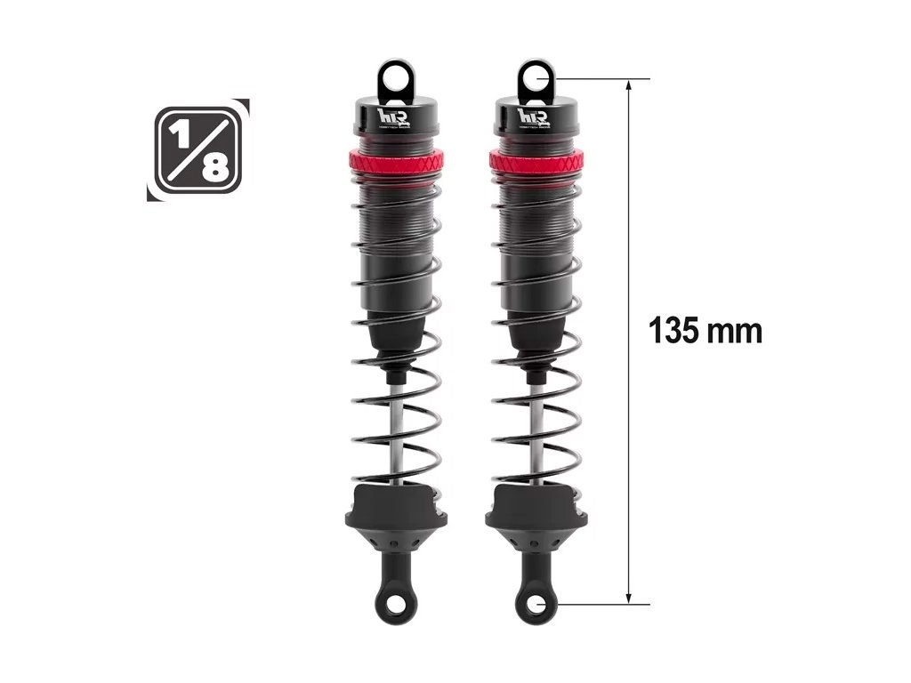 Celohliníkové olejové tlumiče pro modely 1/8 a podobné, Celková délka mezi čepy je 135mm, průměr pístku je 16mm. Sada obsahuje: tři páry pružin: měkké, střední a tvrdé; horní i spodní upevňovací materiál.Doplňkové parametry