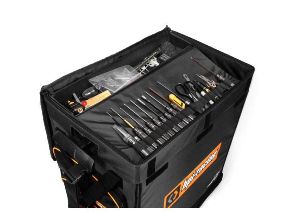 Hlavní část brašny HPI Hauler Bag je opatřena zipem na celé straně, která se sroluje a je zajištěna suchými zipy, aby nepřekážela v zásuvkách. Pět zásuvek z vlnitého plastu vám pomůže uspořádat pneumatiky, náhradní díly, akumulátory, nabíječku, náhradní nářadí, vysílač a vozidlo. Součástí balení jsou tři velikosti zásuvek, které vám umožní nastavit tašku na přepravu tak, aby vám vyhovovala.