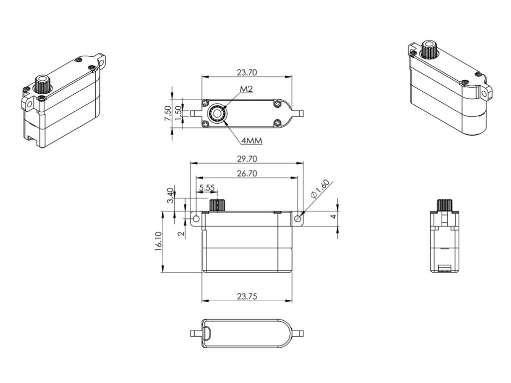 Silné a velmi rychlé programovatelné digitální mikroservo s titanovými převody s výstupní hřídelí uloženou ve dvou kluzných ložiscích; místo potenciometru je magnetický enkodér (Hallův senzor). Díky přesným předepjatým převodům s minimálními vůlemi a ploché krabičce s výškou 7,5 mm je zvláště vhodné pro ovládání křidélek a klapek v RC házedlech F3K, malých větroních a motorových modelech s tenkými profily křídla, jako jsou F5D modely pro závody okolo pylonů. Pro dokonalé chlazení i při vysokém zatížení je servo uloženo v hliníkové krabičce s patkami pro montáž na plocho.