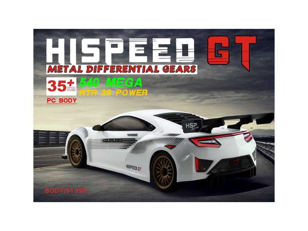 HSP GT je výkonné RC silniční auto v měřítku 1/10 navržené pro vysokou rychlost a jízdu smykem.