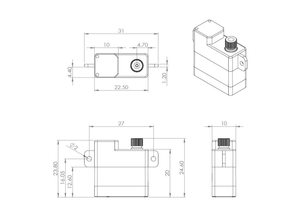 Velmi silné a rychlé programovatelné tenké digitální mikroservo s kovovými převody s výstupní hřídelí uloženou na dvou jehlových a jednom samomazném ložisku. Díky ploché krabičce s výškou 10 mm s patkami pro montáž na plocho je zvláště vhodné pro ovládání křidélek a klapek v RC házedlech, menších větroních a motorových modelech.