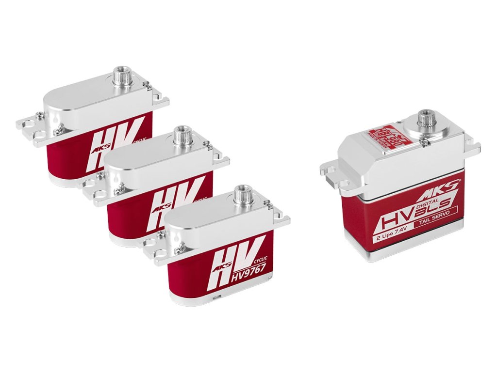 Combo set miniserv/standardního serva pro vrtulníky velikosti 550-600 obsahující 3x HV9767 miniserva pro cykliku a 1x standardní střídavé servo HBL980 (úzkopásmové 760µs) pro ocasní rotor. Kompatibilní s většinou 760µs gyroskopů a flybarless jednotek.