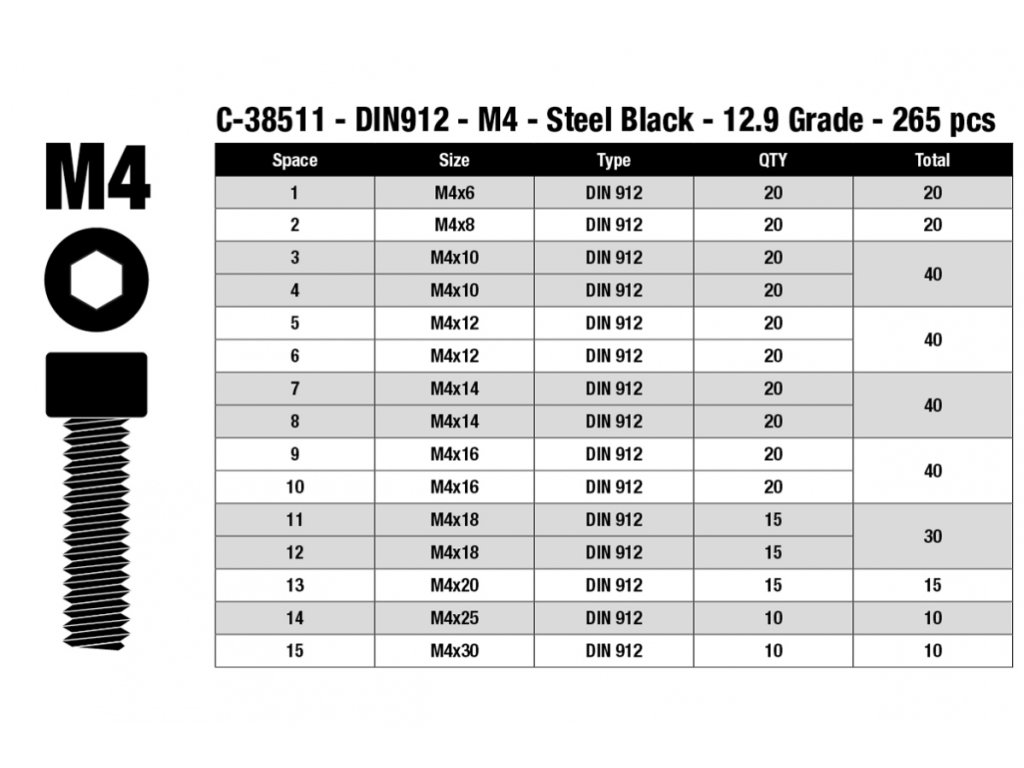 - M4x10 Imbus šroub s válcovou hlavou, ocelový, černý, DIN 912: 40 ks.